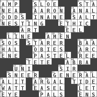 ACROSS 1. Electrical Unit 4. A type of plum 8. R.R. building 11. Teachers' org. 12. Composer Copland 14. Of or related to the anus 15. Probability 17. Lacking in sense or substance 18. Table seasoning 19. Nestling 21. Principle of right and wrong 23. Tate display 24. Snakelike fish 25. Actor's bit 27. So be it 30. Mayday 31. A viewer who gazes fixedly 34. Sound made by sheep 37. Actor Linden 38. Off-Broadway awards 39. Curve 40. Compass dir. 41. Soft color 43. To riddle 44. False hair 45. Swedish rock group 47. University (slang) 49. Title for a knight 50. Contemptuous expression 52. Commissioned military rank 56. Set down 57. Therefore, facetiously 60. Periodic rise and fall of the sea level 61. Electrical Unit 62. Artist's stand 63. Allow 64. Sight organ 65. Friends 66. Followers of ems DOWN 1. Soon (poet.) 2. Ancient Persian 3. Groovy apts. 4. Inhabitant of Heaven 5. Austrian-born American filmmaker Fritz 6. Mouth or opening 7. Period of immesurable duration 8. Slow-paced one 9. Baby powder 10. The first octave above the treble staff 13. Born 14. American tennis player Robert 16. Comedian Laurel of Laurel & Hardy 20. Angers 22. "___ Little Indians" 25. Grant temporary use of 26. Small island 27. Originate 28. Confront 29. Celtic language 30. A female animal or person 32. Drink excessively 33. Blind as ____ 34. Sharp remark 35. Length times width 36. Adept person 42. (Had) reclined 44. Standoff 46. Cy Young winner Saberhagen 47. Join together 48. Remaining after all deductions 49. Makes a sale 50. Kill 51. Actress Charlotte 52. Highlander 53. Cause heat under the collar 54. Arabian gulf 55. Allows 56. Deep reverence 58. Hit sharply and swiftly 59. Girls' org. (abbr.)