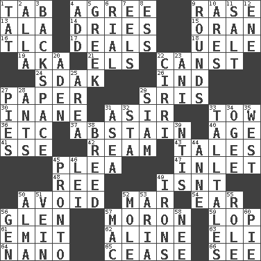 ACROSS 1. Bar bill 4. Match 9. To erase 13. Chicken ___ king 14. Frees from moisture 15. Northwest Algerian city 16. Affectionate concern, for short 17. Allots cards 18. Ubangi River tributary 19. Alias (abbr.) 21. Raised railways 22. 2nd pers. sing. pres. of can (arch.) 24. Neighbor of Neb. 26. Indiana (abbr.) 27. Some stationery 29. Indian titles of respect 30. Empty; void 31. SW Saudi Arabia district 33. Pull behind 36. And so on (abbr.) 37. Choose not to consume 40. Grow older 41. Compass dir. 42. 480, 500 or 516 sheets of paper 43. Stories 45. Entreaty 47. An arm off of a larger body of water 48. To separate or throw off 49. Is not 50. Prevent from happening 52. Third mo. 54. Hearing organ 56. Small, secluded valley 57. Person of subnormal intelligence 59. Chop off 61. Give off 62. Place in a line 63. Biblical high priest 64. Billionth: prefix 65. Stop 66. Perceive with the eye DOWN 1. Make lace 2. Silent film actress Nazimova 3. Keyboard key 4. Increase 5. Of Greece 6. Monetary unit of Yemen 7. Snakelike fish 8. Curvy letter 9. Periods in a boxing match 10. Ancient Greek god of war 11. Table seasoning 12. Compass dir. 20. An important port of Yemen 22. High-altitude cloud 23. Cuckoo 25. Length times width 27. Sliced desserts 28. Pismires 29. Thailand, formerly 31. Toward the sea 32. R.R. building 33. Baron Munchausen's specialties 34. Double curve, resembling the letter S 35. Compass direction 38. A special lineage 39. Nuclear Threat Initiatives 44. Queen of England 1702-14 45. Right away 46. Luau accessory 49. Removes the wrinkles 50. _ mater 51. Distinctive style or manner 52. Undercover agent 53. Roberta Peters solo 55. Hero or heavy, e.g. 56. Commissioned military rank (abbr.) 57. Apple computer (short form) 58. Born 60. Sliced dessert