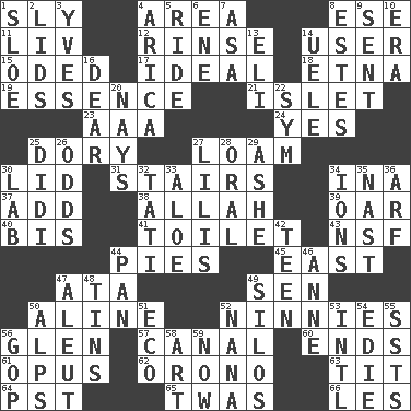 ACROSS 1. Cunning 4. Type of rug 8. Compass dir. 11. 54 in ancient Rome 12. Wash lightly 14. One who makes use of a thing 15. Wrote a lyric poem 17. Perfect 18. Inactive volcano in Sicily 19. Substance 21. Small island 23. American Automobile Association (abbr.) 24. It is so 25. Small, narrow, flatbottom fishing boat 27. Rich soil 30. Flaplike covering 31. Flight of steps 34. _ tizzy (2 wds.) 37. Increase 38. Assad's deity 39. Boat paddle 40. Altar cloth linen 41. Bathroom plumbing fixture 43. Science/research agcy. 44. Sliced desserts 45. 90 degrees 47. "One Day ___ Time" 49. Elected rep. 50. Place in a line 52. Simpletons 56. Small, secluded valley 57. Lessep's creation 60. Extremities 61. Musical composition 62. U. of Maine site 63. Teat (slang) 64. Pacific Standard Time (abbr.) 65. It was, poetically 66. French article DOWN 1. _ gin 2. Hats (slang) 3. Jacques Cousteau's middle name 4. N. Chile seaport 5. Travel on an animal 6. Compass dir. 7. White ___ sheet 8. _____ Park, CO 9. Posted 10. Epoch 13. Biblical high priest 14. Ubangi River tributary 16. Letter starter 20. Negative votes 22. Symbol (abbr.) 25. "You Light Up My Life" star Conn 26. Probability 27. Ms. Damita and namesakes 28. Taken by mouth 29. American tennis player Robert 30. Experiment locale 32. Jacques of French films 33. _ vera 34. Charged particles 35. Political cartoonist Thomas 36. Sandy's bark 42. Adolescent 44. Baking dish 46. Singer Murray 47. Native American of Southwest Alaska 48. Airtight sealed metal containers 49. Grain storage towers 50. High mountains 51. Environmental prefix 52. Nanny 53. International (abbr.) 54. Singer Brickell 55. Fast planes 56. Republican Party 58. Tate display 59. Immediately