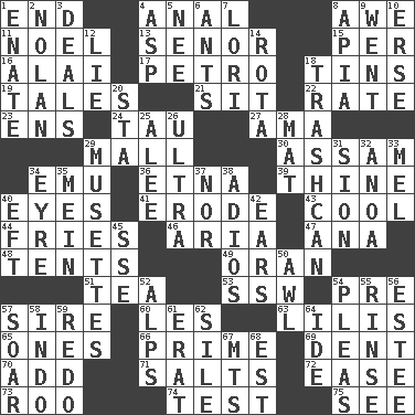 ACROSS 1. Conclude 4. Of or related to the anus 8. Deep reverence 11. Christmas carol 13. Sir (Sp.) 15. For each 16. Mountain range southwest of Kyrgyzstan 17. Stone: prefix 18. Canisters 19. Stories 21. Be seated 22. Assign a rank or rating to 23. Followers of ems 24. The 19th letter of the Greek alphabet 27. Housemaid (var.) 29. Promenade 30. Indian state 34. Australian flightless bird 36. Inactive volcano in Sicily 39. One or ones belonging to thee 40. Snake ____ (dice throw) 41. Wear away 43. Calm and collected 44. Strips of potato fried in deep fat 46. Operatic vocal solo 47. Santa ___, CA 48. Portable shelters 49. NW Algerian seaport 51. Beverage made from leaves 53. Compass dir. 54. Before (prefix) 57. The founder of a family 60. French article 63. Ms. Damita and namesakes 65. Washington bills 66. First class 69. Scratch 70. Increase 71. Table seasonings 72. Comfort 73. Friend of Pooh 74. Trial 75. Perceive with the eye DOWN 1. Maternal 2. Pitcher Ryan 3. Allots cards 4. Viper 5. Born 6. Pismires 7. Australian parrot (variant) 8. Capital of Western Samoa 9. Left 10. Celtic language 12. Whopper 14. Round or rotation of duties 18. File 13 20. R.R. building 25. Toward shelter 26. Extreme 28. Floor protector 29. French bagpipes 31. The Jewish people; Israel 32. Small Philippine buffalo 33. Cartoonist voice _ Blanc 34. Jane of fiction 35. Chow _ 37. Not either 38. Goodbye (Sp.) 40. Bank Draft (abbr.) 42. Hearing organs 45. Compass dir. 50. Leather borer 52. High mountains 54. Entreaties 55. Wash lightly 56. First name in cosmetics 57. Fly high 58. Southeast Asian peninsula 59. Make new 61. Part of Q.E.F. 62. Filth; sediment 64. Binary compound 67. Mountains (abbr.) 68. Eastern Standard Time (abbr.)