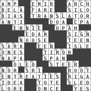 ACROSS 1. Electrical Unit 4. Arab leader 8. Bowlike part 12. Actor Lugosi 14. Conductor's collection 15. Grain storage tower 16. Prejudice 17. Interpreter 20. Against 21. ___ good deed 22. Tax preparer (abbr.) 23. Bert's buddy 27. Brightly colored fish 29. Dutch treat 31. Public display of a written message 34. Trap for birds or small mammals 35. Adolescent 36. "Two Mules for Sister ____" 39. Car or cant ending 41. Capri or Wight 42. Washington bills 43. Southeast Indonesia island 46. California wine valley 47. Connect, as a bridge 48. Butter sub 51. Bull 54. And not 56. _ Lanka 58. Carrot, for example 61. Pleas 66. Capital of Latvia 67. It may be bright or harebrained 68. Carry 69. Downhill vehicle 70. Old wives' tales, e.g. 71. At one time in the past 72. Consenting reply DOWN 1. Swedish rock group 2. Chow _ 3. Food holder 4. Lizard (obsolete) 5. Third mo. 6. Retirement account (abbr.) 7. Tear apart 8. White ___ sheet 9. Actors Guy, Robert Welles, and Clint 10. Hoof sound 11. Israeli folk dance 13. SW Saudi Arabia district 18. "Barney Miller" actor Jack 19. Pet locale 24. Modern: prefix 25. Wedding promise 26. Relaxation 28. Moving about 30. Confronts 32. Set 33. Compass dir. 34. Rhinal 36. Male offspring 37. Santa ___, CA 38. News announcer 40. Cuts off 44. Floor covering 45. Single 49. Compass dir. 50. Mouth or opening 52. Blunders 53. Agitated, as a liquid 54. Famous astronaut Armstrong 55. Southwest Nigerian state 57. "Tell ____ the Marines!" 59. Double curve, resembling the letter S 60. Bits 62. Actress Charlotte 63. Electrically charged atom 64. And so on (abbr.) 65. Observe