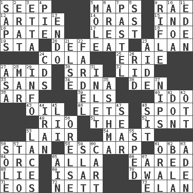 ACROSS 1. Ooze 5. Atlas contents 9. Actress Charlotte 12. Nick name for Arthur 14. Mouths or openings 15. Working for oneself (abbr.) 16. Eucharist need 17. For fear that 18. Enemy 19. R.R. building 20. Outscore 23. Actor Alda or Thicke 24. Root beer relative 25. 4th largest of the Great Lakes 27. Among 30. Indian title of respect (Mr.) 32. Hat (slang) 33. Without 34. Pulitzer Prize-winning author Ferber 36. Lair 38. Sandy's bark 39. Raised railways 40. Wedding promise 43. Lubricate 46. Allows 48. Blemish 49. _ de Janeiro 51. Definite Article 52. Is not 53. Den 54. Vertical spar for supporting sails 56. Comedian Laurel of Laurel & Hardy 58. Fortification 61. Chief or king in Benin or Nigeria 64. The grampus (Milton) 65. Silent film actress Nazimova 66. Having ears or earlike features 68. Untruth 69. Austrian river, tributary to the Danube 70. A sleeping potion; an opiate (poet.) 71. Greek goddess of the dawn 72. Remaining after all deductions 73. Style DOWN 1. Plant excrements 2. Part of Q.E.F. 3. Singer James 4. Sliced dessert 5. Undercover agent 6. Type of rug 7. Soft color 8. Fast jet (abbr.) 9. Firearm 10. Small Philippine buffalo 11. Paradise 13. Inside; within (prefix) 21. Otherwise 22. Bundle 23. Assistant 24. Music discs 26. To free from 27. White ___ sheet 28. Third mo. 29. Information 31. An arm off of a larger body of water 35. Respiratory problem 37. Pinches, bites 41. Spanish title 42. Baseball player Mel 44. SW Asia republic 45. Cards in a Roman deck? 47. Singe 48. Be seated 50. Threatening words 53. Shoestrings 55. Drove too fast 56. Not divided or shared with others 57. Musical group of three 59. Narrow board 60. Haul 61. Of the mouth 62. Actor Lugosi 63. An important port of Yemen 65. The 18th letter of the Arabic alphabet 67. Deep reverence