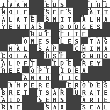 ACROSS 1. _ the terrible 5. Begley and Asner 8. Three (prefix) 11. Undercover agent 12. Perceives with the eye 14. Small island 15. Having winglike extensions 17. In a ____ (agitated or irritated) 18. _ mater 19. Gossips 21. Evades 23. Regret 25. Writer Wiesel 26. Singles 27. French article 28. Label 31. Actor Linden 33. Plant excrement 35. Large country 37. Root beer relative 38. Purpose 40. Southwest Nigerian state 41. High up in or into the air 43. Binary compound 45. Marina Del _, California 46. Portuguese money of account (variant) 47. Choose 50. The content of cognition 52. Nanny 53. Nervous spasm 54. Electrical Unit 56. Eats (away) 61. Cy Young winner Saberhagen 62. Russian ruler of old 65. A salt of uric acid 66. Help 67. Elected reps. 68. Johnson of "Laugh-In" 69. Actress Charlotte 70. Saxophone 71. Lick closed DOWN 1. "If ____ say so..." 2. Grand slam 3. ____ Jay Lerner 4. Remaining after all deductions 5. Double-curved letter 6. Lair 7. Beer mug 8. Lie 9. Basketball hoops 10. Call ___ day 13. Took without asking 16. Merit 18. Personal question 20. Takes to court 22. Compact _ 24. Son of Isaac 26. Norwegian king 28. Prong on a fork 29. "60 Minutes" Commentator Rooney 30. E Mali city 31. Hollow 32. _ vera 34. 23rd letter of the Greek alphabet 36. Israeli folk dance 37. 4-wheeled motor vehicle 39. Prepare for publication 42. Heavy book 44. Singer Brickell 48. Components 49. College papers 51. Shade of tan 52. Fitting 54. Roberta Peters solo 55. Ancient Persian 57. Mouths or openings 58. Have the gumption 59. Singer James 60. Stitch closed the eyes of (a falcon) 61. Drinking establishment 63. Santa ___, CA 64. Acura sports coupe
