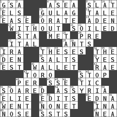 ACROSS 1. Girls' org. (abbr.) 4. Toward the sea 8. Narrow board 12. Raised railways 13. POW camp 14. Falsehood 15. Relaxation 17. Declaim 18. An important port of Yemen 19. Sans 21. Dirtied 23. R.R. building 24. Was introduced to 26. Before (prefix) 27. Slanted text style (abbr.) 28. Pismires 30. Retirement account (abbr.) 31. College papers 34. Definite Article 37. Lair 38. Table seasonings 39. Affirmative reply 40. Eastern Standard Time (abbr.) 41. Place for singles 42. Actress Charlotte 43. "Corrida" creature 44. Obstruct or block passage 46. For each 47. Compass dir. 50. Nervous spasm 51. Flew 54. Nineveh was its capital 57. Writer Wiesel 58. Prepares for publication 60. Pulitzer Prize-winning author Ferber 62. Gone 63. Music written for nine 64. _ tizzy (2 wds.) 65. Sense of smell 66. Fast planes 67. Teachers' org. DOWN 1. Turn to the right 2. Cole _ (cabbage dish) 3. Aide 4. Gold (Symbol: Au) 5. Chalkboard 6. Ingest 7. Matures 8. Flight of steps 9. Dipping utensil 10. Toward shelter 11. Watch over 13. Thick or sticky substance 16. Singer James 20. Actor Linden 22. Elects 25. Clothes sense 27. Angers 29. A home for chicks 30. Binary compound 31. Russian ruler of old 32. Rings 33. Pipe bend 34. Polypeptide antibiotic 35. Pile 36. Compass dir. 41. Had on 43. Cigar-shaped 44. Filthy place 45. Hoop that covers a wheel 46. Aches 48. Virtuous person 49. _____ Park, CO 51. Stitched 52. Margarine 53. Cub Scout units 55. Fast jet (abbr.) 56. Queen of England 1702-14 59. Two (Sp.) 61. Auto club (abbr.)