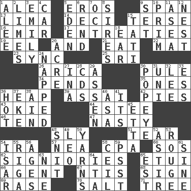 ACROSS 1. Actor Baldwin 5. Greek god of love 9. Connect, as a bridge 13. Pale green bean 14. Tenth: prefix 15. Laconic 16. Arab leader 17. Pleas 19. Snakelike fish 20. Also 21. Consume 22. Floor covering 23. Synchronize (abbr.) 25. Indian title of respect (Mr.) 26. N. Chile seaport 30. Whine 34. Hangs 35. Washington bills 36. Pile 39. Slender Brazilian palm 42. Sliced desserts 43. Migrant worker of the '30s 44. First name in cosmetics 46. Be inclined (to) 47. Characterized by obscenity 48. Stealthy 51. Rend 54. Retirement account (abbr.) 57. Teachers' org. 58. Tax preparer (abbr.) 60. Mayday 62. Seigniories (variant) 65. Needle case 66. Representative 67. Nuclear Threat Initiatives 68. Attach a signature 69. To erase 70. Table seasoning 71. Relationship diagram DOWN 1. Toward shelter 2. Citrus fruits 3. Poet Dickinson 4. Automobile 5. Genesis locale 6. Tear apart 7. Sep. follower 8. Founders of families 9. Put into a specified state 10. Demure 11. At sea 12. A home for chicks 15. Jacques of French films 18. Ewer handle 20. 43,560 square feet 24. Slept 27. _ tizzy (2 wds.) 28. Music discs 29. NE Netherlands city 30. Wimpy's pal 31. Single; one (prefix) 32. Area sheltered from the wind 33. Double-curved letter 36. Being at a high temperature 37. Supplement with great effort 38. The 18th letter of the Arabic alphabet 40. White ___ sheet 41. ___ a Wonderful Life 45. Singer James 48. In a ____ (agitated or irritated) 49. Lion 50. Tall tales 52. Moving about 53. Makeup applied to the cheeks 54. Austrian river, tributary to the Danube 55. Port city in Latvia 56. Ripens 58. To provide with a ceiling 59. Inconspicuous attention getter 61. Trig term 63. Compass dir. 64. Call ___ day 65. Eastern Standard Time (abbr.)
