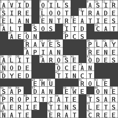 ACROSS 1. Enthusiastic 5. Lubricates 9. SW Saudi Arabia district 13. Father 14. Plunder 15. Swap 16. Flair 17. Pleas 19. Keyboard modifier key 20. Mayday 21. It would 22. Domesticated feline 23. A really long time 25. Personal Computers (abbr.) 26. All-night dance parties 30. Shaw product 34. Bee-related 35. French philosopher Descartes 36. Came down and settled, as after flight 39. Came up 42. Lyric poems 43. Connecting point 44. Sea 46. Colored 47. Tinged 48. Australian flightless bird 51. Hero or heavy, e.g. 54. Plant excrement 57. One of the 12 tribes of Israel 58. She-sheep 60. Single 62. Conciliate 65. Russian ruler of old 66. Nest on high 67. Airtight sealed metal containers 68. Allows 69. Nathan's nickname 70. Part of Q.E.F. 71. Algonquian DOWN 1. Toward the sea 2. Country estate 3. Feeling or showing extreme anger 4. Lair 5. Margarine 6. Charged particles 7. Car dealer's back yard 8. Long narrow piece of something 9. Tate display 10. Ketch in the Levant 11. The content of cognition 12. Respite 15. Bits 18. And so on (abbr.) 20. Fastener 24. Declaimed 27. By way of 28. Hearing organ 29. Snout, nose 30. Right away 31. Directed 32. A saturated hydrocarbon 33. It is so 36. Added to 37. Myrna of the movies 38. Binary compound 40. _-fi 41. Car or cant ending 45. 1/640 square mile 48. Singer Brickell 49. Floor covering 50. Join together 52. Failure 53. Related on the mother's side 54. Connect, as a bridge 55. Type of rug 56. Left side of a ship or aircraft 58. Inactive volcano in Sicily 59. Compass direction 61. Celtic language 63. Sliced dessert 64. Wind 65. Affectionate concern, for short