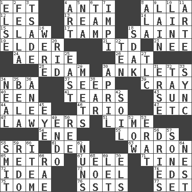 ACROSS 1. Bank Draft (abbr.) 4. Opposed to 8. Silent film actress Nazimova 12. French article 13. 480, 500 or 516 sheets of paper 14. Den 15. Cole _ (cabbage dish) 17. Pack (down) 18. Virtuous person 19. A person who is older than you are 21. It would 23. Born 24. Nest on high 26. Erode 28. Dutch treat 30. Short socks 34. Basketball assoc. 37. Ooze 39. Supercomputer manufacturer 40. Car or cant ending 41. Rends 43. Player for Phoenix 44. Toward shelter 46. Musical group of three 47. And so on (abbr.) 48. Those who practice law 51. Welles in "The Third Man" 54. Compass dir. 55. Nobles 58. Indian title of respect (Mr.) 61. Lair 63. Make _____ (do battle with) 65. Paris' subway 67. Ubangi River tributary 71. Prong on a fork 72. The content of cognition 73. Christmas carol 74. Begley and Asner 75. Heavy book 76. Fast planes 77. Put into a specified state DOWN 1. Otherwise 2. Man or boy (slang) 3. Sadhe (variant) 4. Nonscientific branch of learning 5. Teachers' org. 6. Scottish cap 7. Body of Kaffir warriors 8. In the manner of 9. (Had) reclined 10. Actor's bit 11. Johnson of "Laugh-In" 16. We are 18. Neighbor of Neb. 20. To free from 22. "___ Little Indians" 25. Compass direction 27. Affectionate concern, for short 29. Confronts 30. Showery time 31. Celtic language 32. Tense 33. Synchronize (abbr.) 34. Actress Patricia 35. Actor Lugosi 36. Afresh 38. Ewer handle 42. Earth 45. Sight organ 49. Inside; within (prefix) 50. To riddle 52. Cut the grass 53. Part of Q.E.F. 56. Frees from moisture 57. Message 58. Stricken, poetically 59. Redecorate 60. A whole individual unit 62. Religious women 64. Egg locale 66. Actress Charlotte 68. Greek goddess of the dawn 69. Allow 70. Raised railways