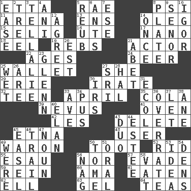 ACROSS 1. Singer James 5. Actress Charlotte 8. 23rd letter of the Greek alphabet 11. Sports stadium 13. Followers of ems 14. Cassini of fashion 15. Major League Baseball Commissioner Bud 16. Shoshoni 17. Billionth: prefix 18. Snakelike fish 19. Confederate soldiers (slang) 21. Thespian 22. Eons 24. Fermented drink made from hops 25. Place for singles 27. A female animal or person 29. 4th largest of the Great Lakes 30. Feeling or showing extreme anger 32. Adolescent 33. Showery time 35. Root beer relative 39. Congenital growth or mark on the skin 41. Baking chamber 42. French article 43. Keyboard key 45. Inactive volcano in Sicily 48. One who uses or employs something 49. Make _____ (do battle with) 50. A blast of a horn 52. To free from 55. Son of Isaac 56. Not either 57. Elude 59. It's straight from the horse's mouth 60. Housemaid (var.) 61. Consumed 62. Pipe bend 63. Set 64. Beverages made from leaves DOWN 1. Comfort 2. Woody plant 3. Copy Pinocchio 4. Cuckoo 5. Reuben's nickname 6. Pismires 7. Compass dir. 8. Food holder 9. Sir (Sp.) 10. Composer Stravinsky 12. Match 14. At one time in the past 20. Eastern Standard Time (abbr.) 21. Collude with 23. American astronaut and politician John 25. Soggy 26. "We ___ not amused" (Victoria) 27. _ Lanka 28. Actor Linden 30. Big collection agency 31. Learning spot: Fr. 33. "___ Maria" 34. Suppuration 36. Make much ado about nothing 37. Allow 38. A saturated hydrocarbon 40. Liveliness 43. Superhero pair 44. First name in cosmetics 45. Artist's stand 46. Go after with the intent to catch 47. Part of speech 49. We are 50. Heavy book 51. Of the mouth 53. The main thing one is thinking about 54. Lairs 56. Tired old horse 58. Large container