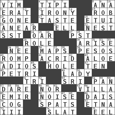 ACROSS 1. Zeal 4. Native american tent (variation) 8. Santa ___, CA 11. Part of Q.E.F. 13. Literary sarcasm 15. Director Reiner 16. Went 17. Clothes sense 18. Needle holder 19. Approach 21. Pipe bend 22. A home for chicks 23. Fast jet (abbr.) 24. Rowing implement 27. Pacific Standard Time (abbr.) 29. Hero or heavy, e.g. 30. Originate 34. Born 36. Atlas contents 39. Mexican monetary units 40. Play 41. Bitter 43. _ vera 44. Goodbye (Sp.) 46. Hollow 47. Nine, plus one 48. _ dish (used to culture cells) 49. Kenny Rogers chart-topper in '80 51. Three (prefix) 53. _ Lanka 54. Baking dish 57. Have the gumption 60. Or not 63. Country residence 65. Independent ruler or chieftain 66. Annoying sound 69. Raised platform 70. Gear tooth 71. Arguments over trivial matters 72. Inactive volcano in Sicily 73. One more than two 74. Narrow board 75. Snakelike fish DOWN 1. Viva Las _ 2. Removes the wrinkles 3. French painter Edouard 4. Teat (slang) 5. Lyricist Gershwin 6. Introduce or present, as a question 7. International (abbr.) 8. Johnson of "Laugh-In" 9. Common sense 10. "This won't hurt ____!" 12. Beverage made from leaves 14. Sharp bark 18. Plea 20. Friend of Pooh 25. _ mater 26. Arrive at 28. Plant excrement 29. Newsperson 31. Small island 32. Within a short period 33. Compass dir. 34. Connecting point 35. Give off 37. Adept person 38. Beverly of Met fame 40. Hit sharply and swiftly 42. Letter starter 45. Title for a knight 50. HTML Container Element 52. Lodging establishments 54. Food holder 55. Place in a line 56. Relating to the nose 57. Tenth: prefix 58. Mine, in Marseilles 59. Swiss mountan, "Queen of the Mountains" 61. I made a mistake 62. Monetary unit of Yemen 64. Binary compound 67. R.R. building 68. Eastern Standard Time (abbr.)