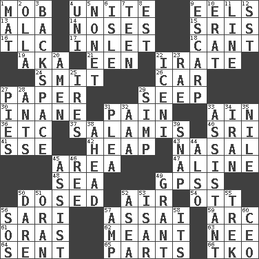 ACROSS 1. Crowd into 4. Join together 9. Snakelike fish 13. Wing 14. Olfactory organs 15. Indian titles of respect 16. Affectionate concern, for short 17. An arm off of a larger body of water 18. Patter 19. Alias (abbr.) 21. Car or cant ending 22. Feeling or showing extreme anger 24. Stricken, poetically 26. Automobile 27. Some stationery 29. Ooze 30. Silly 31. Ache 33. The 18th letter of the Arabic alphabet 36. And so on (abbr.) 37. Deli grouping 40. _ Lanka 41. Compass dir. 42. Pile 43. Rhinal 45. Length times width 47. Place in a line 48. Ocean 49. Global Positioning Systems (abbr.) 50. Administered medicine 52. Wind 54. Baseball player Mel 56. Indian skirt 57. Slender Brazilian palm 59. Curve 61. Mouths or openings 62. Intended 63. Born 64. Emitted 65. Pieces 66. Ring climax DOWN 1. Floor protector 2. Spanish pot 3. Keyboard key 4. Corn or form start 5. Music written for nine 6. Small island 7. Adolescent 8. Eastern Standard Time (abbr.) 9. Fortification 10. Part of Q.E.F. 11. Actor's bit 12. Fast jet (abbr.) 20. So be it 22. Ancient Celtic tribe of eastern Britain 23. Actress Charlotte 25. Angers 27. Sliced desserts 28. Pismires 29. Simple or foolish person 31. Entreaty 32. Auto club (abbr.) 33. Helper 34. SW Asia republic 35. "Death on the ____" 38. Toward the future 39. Fastener 44. In addition 45. Help 46. Portuguese money of account (variant) 49. Monetary aid 50. Have the gumption 51. NW Algerian seaport 52. Toward the sea 53. Austrian river, tributary to the Danube 55. Long journey 56. Distress signal 57. Electrical Unit 58. ___ a Wonderful Life 60. Corporate head (abbr.)