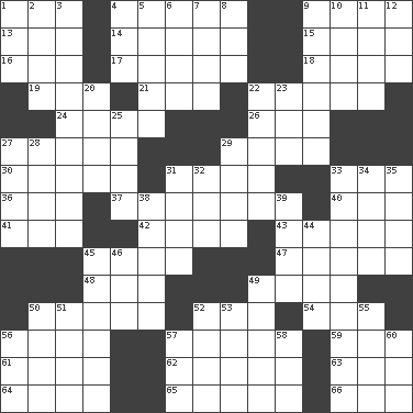 ACROSS 1. Overdraft (abbr.) 4. Locates 9. Unable to walk 13. Epoch 14. 1973 Nobel Price Winner (Physics) Leo 15. Uhlan (variant) 16. Petroleum 17. A person who is older than you are 18. Arranges properly for use 19. Compass dir. 21. Double-curved letter 22. _____ Park, CO 24. Part of Q.E.F. 26. Wind 27. Giggle 29. Singer James 30. U. of Maine site 31. Lacquered or enameled metalware 33. The 18th letter of the Arabic alphabet 36. Bear (Spanish) 37. Snuggling 40. What Jean-Claude Killy likes to do 41. Directed 42. Nathan's nickname 43. Columnist Joseph or Stewart 45. Burn to charcoal 47. Aches 48. Car dealer's back yard 49. Equivocates 50. Having winglike extensions 52. R.R. building 54. Parent Teacher Association (abbr.) 56. So be it 57. Memphis, Tenn. Street 59. Personal question 61. Having great length 62. Composer Copland 63. Compass dir. 64. Hats (slang) 65. Came up 66. Shallow baking pan DOWN 1. Modern: prefix 2. Indian titles of respect 3. It jiggles the polygraph 4. Observe 5. Small island 6. Small boys 7. Makes supply last 8. Title for a knight 9. A period of five years 10. Toward shelter 11. Floor coverings 12. Followers of ems 20. Songbird 22. Consumed 23. Be seated 25. Age 27. Implement 28. Celtic language 29. Writer Wiesel 31. Russian ruler of old 32. Baseball player Mel 33. Aide 34. Visual representation of an object 35. Cuts off 38. Maternal 39. Yawn 44. Desk light 45. Rigngs loudly 46. Being at a high temperature 49. Saint headwear 50. Mine, in Marseilles 51. Grant temporary use of 52. Dry up 53. Edible starchy tuberous root 55. Hindu god of fire 56. Everything 57. Sound made by sheep 58. Compass dir. 60. Car or cant ending
