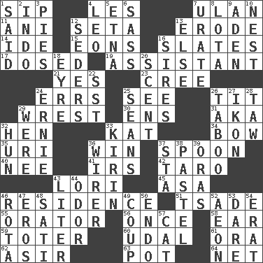 ACROSS 1. Small drink 4. French article 7. ____ Bator 11. Black tropical American cuckoo 12. Bristle 13. Eat (away) 14. Binary compound 15. Immeasurably long periods of time 16. Chalkboards 17. Administered medicine 19. Aide 21. Consenting reply 23. Algonquian 24. Blunders 25. Observe 26. Teat (slang) 29. Take or capture by force 30. Followers of ems 31. Alias (abbr.) 32. Layer 33. Krazy ___ of comics 34. Arrow shooter 35. RI univ. 36. Acquire through effort 37. Soup utensil 40. Born 41. Big collection agency 42. Pacific island yam 43. Australian parrot (variant) 45. White ___ sheet 46. Dwelling 51. Sadhe (variant) 55. Speaker 56. Single time 58. Ewer handle 59. Carrier 60. Allodial 61. Mouth or opening 62. SW Saudi Arabia district 63. Cooking vessel 64. Fish or hair follower DOWN 1. Stated 2. Southeast Asian peninsula 3. Sliced desserts 4. Lion 5. Inactive volcano in Sicily 6. Backtalk 7. A salt of uric acid 8. Globular water bottle used in Asia 9. Arabian gulf 10. A home for chicks 12. Spring feasts 13. Otherwise 16. Fathers 18. Jane of fiction 20. Aroma 22. Fast jet (abbr.) 24. Bert's buddy 25. Actors Connery and Penn 26. Off limits 27. Picture 28. The 23rd letter of the Hebrew alphabet 29. We are 32. Attila the _ 33. Japanese brewing company 36. One who wires 37. R.R. building 38. Soft color 39. Mouths or openings 43. 61 cubic inches 44. Scent 46. Roll call or roster of names 47. Greek god of love 48. Suttee (variant) 49. Clever action or accomplishment 50. Inside; within (prefix) 52. Period of immesurable duration 53. Have the gumption 54. Part of Q.E.F. 57. Feline