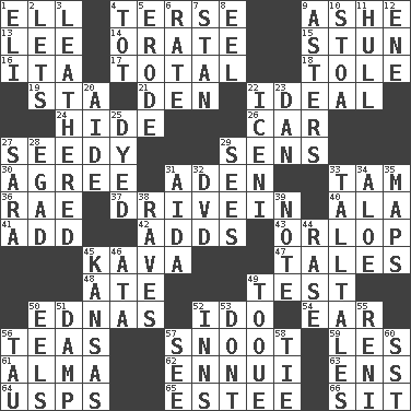 ACROSS 1. Pipe bend 4. Laconic 9. American tennis player Robert 13. Area sheltered from the wind 14. Speak pompously 15. Astound 16. Call ___ day 17. "_____ Recall" 18. Lacquered or enameled metalware 19. R.R. building 21. Lair 22. Perfect 24. Flintstone garb 26. Automobile 27. Full of seeds 29. Elected reps. 30. Match 31. An important port of Yemen 33. Scottish cap 36. Actress Charlotte 37. Popular '50s hangout 40. In the manner of 41. Find the sum of 42. Sums up 43. Fourth or lowest deck 45. Polynesian shrub of the pepper family 47. Stories 48. Had dinner 49. Trial 50. Ferber et al. 52. Wedding promise 54. Ewer handle 56. Beverages made from leaves 57. Snob 59. French article 61. _ mater 62. World-weariness 63. Followers of ems 64. United States Postal Service (abbr.) 65. First name in cosmetics 66. Be seated DOWN 1. Connecticut Ivy Leaguer 2. Allows 3. Resembling or made to resemble leather 4. Small child 5. Eat (away) 6. Assign a rank or rating to 7. Comedian Laurel of Laurel & Hardy 8. Snakelike fish 9. Michaelmas daisies 10. Portico 11. Frame or body of a ship 12. Compass dir. 20. Assistant 22. Ancient Celtic tribe of eastern Britain 23. Daniel's nick name 25. Colored 27. "Two Mules for Sister ____" 28. Mild oath 29. Observes 31. Opera by Verdi 32. Movie disc 33. Baron Munchausen's specialties 34. Medicinal plant 35. Atlas contents 38. All-night dance parties 39. Musical sound 44. To erase 45. Sunflower state 46. "One Day ___ Time" 49. Woman's close-fitting hat 50. Snakelike fish 51. Moist 52. Lodging establishments 53. Do not 55. Painter Guido (1575-1642) 56. The 19th letter of the Greek alphabet 57. Observe 58. Make a knot 60. Fast jet (abbr.)