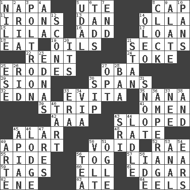 ACROSS 1. California wine valley 5. Shoshoni 8. Head covering 11. Metal shackles 13. Daniel's nick name 14. Spanish pot 15. Pale purple color 16. Increase 17. Grant temporary use of 18. Ingest 19. Lubricates 21. Religious groups 22. Monthly bill 24. Puff or smoke 25. Eats (away) 27. Chief or king in Benin or Nigeria 29. The Jewish people; Israel 30. Connects, as a bridge 32. Pulitzer Prize-winning author Ferber 33. Webber/Rice musical 35. Grandmother 39. Empty completely 41. Sign of something about to happen 42. American Automobile Association (abbr.) 43. Inclined 45. Having or resembling wings 48. Pace 49. To the left, to Queeg 50. Nothingness 52. Actress Charlotte 55. Travel on or in a vehicle 56. Coat; cloak 57. Climbing, woody, usually tropical vines 59. Labels 60. Pipe bend 61. _ Allan Poe 62. Compass dir. 63. Had dinner 64. Snakelike fish DOWN 1. "Death on the ____" 2. Operatic vocal solo 3. Coward 4. Santa ___, CA 5. Hereditary estate 6. Small boys 7. Conclusion 8. Timepiece 9. Having winglike extensions 10. Baking dishes 12. Biscuitlike quick bread 14. Margarine 20. ___ a Wonderful Life 21. Comedian Laurel of Laurel & Hardy 23. Ferber et al. 25. Compass dir. 26. To free from 27. Choose 28. Sound made by sheep 30. Small drink 31. Snob 33. Period 34. By way of 36. Electrical Measurement 37. Born 38. Added to 40. Small pie 43. Indian title of respect (Mr.) 44. Dipping utensil 45. Bee-related 46. Cabin 47. Ancient Greek god of war 49. Johnson of "Laugh-In" 50. Electrical Unit 51. Stare 53. Of or related to the anus 54. Hearing organs 56. Afternoon social gathering 58. Binary compound