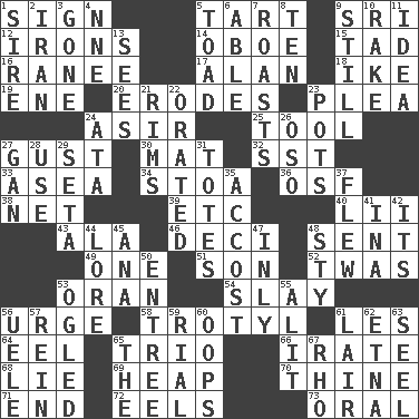 ACROSS 1. Attach a signature 5. Small pie 9. Indian title of respect (Mr.) 12. Metal shackles 14. Mitch Miller's instrument 15. Small boy 16. The wife of a rajah (variant) 17. Actor Alda or Thicke 18. D.D.E's nickname 19. Compass dir. 20. Eats (away) 23. Entreaty 24. SW Saudi Arabia district 25. Instrument 27. Abrupt rush of wind 30. Floor covering 32. Fast jet (abbr.) 33. At sea 34. Portico 36. Order of Saint Francis (abbr.) 38. Fish or hair follower 39. And so on (abbr.) 40. Cards in a Roman deck? 43. Chicken ___ king 46. Tenth: prefix 48. Emitted 49. Single 51. Male offspring 52. It was, poetically 53. Northwest Algerian city 54. Kill 56. Goad 58. Trinitrotoluene 61. French article 64. Snakelike fish 65. Musical group of three 66. Feeling or showing extreme anger 68. Falsehood 69. Pile 70. One or ones belonging to thee 71. Conclusion 72. Snakelike fish 73. Taken by mouth DOWN 1. Title for a man of rank and authority 2. SW Asia republic 3. Went 4. Compass dir. 5. Frog relative 6. Competent 7. Cooks with dry heat, as in an oven 8. "___ Little Indians" 9. Free from disturbance or agitation 10. Libertine 11. It may be bright or harebrained 13. Perceives with the eye 21. Basketball hoops 22. Spoke pompously 23. Plant holders 24. _ moment's notice (2 wds.) 26. Bear (Spanish) 27. Separate the seeds from cotton 28. Purpose 29. Stalk of a moss capsule 31. Hauls 35. Buttonhole 37. Soared 41. _ tizzy (2 wds.) 42. It is 44. Old wives' tales, e.g. 45. Santa ___, CA 47. Inwardly 48. Filthy place 50. Main course 53. Stared at amorously 55. Came down and settled, as after flight 56. Ubangi River tributary 57. It's straight from the horse's mouth 59. Monetary unit of Yemen 60. I made a mistake 61. Den 62. Inactive volcano in Sicily 63. Stitch closed the eyes of (a falcon) 65. Definite Article 67. 17th letter of the Greek alphabet