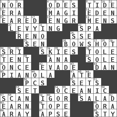 ACROSS 1. Or not 4. Lyric poems 8. Event that recurs at intervals 12. Period 13. Wise men 14. Locale of original sin 15. Having ears or earlike features 18. Engineer (abbr.) 19. Not women's 20. Imposing or collecting, as a tax 22. Health resort 23. Former U.S. Attorney General Janet 24. Compass dir. 25. Elected rep. 26. The distance a bow sends an arrow 30. Indian title of respect (Mr.) 33. Atmospheres 36. Lacquered or enameled metalware 37. Portable shelter 39. Santa ___, CA 40. Not divided or shared with others 41. Single time 42. Dodge 44. Daniel's nick name 45. Player piano 47. Had dinner 50. Personal Computers (abbr.) 51. Arranges properly for use 53. Put into a specified state 54. Pertaining to the sea 57. Skim 59. Composer Stravinsky 61. First course 63. Merit 64. Drink excessively 65. Mouth or opening 66. Like ___ of sunshine 67. Domed church section 68. Filthy place DOWN 1. Born 2. Of the mouth 3. More valued for its uncommonness 4. Presage 5. Mild oath, euphamism for damn 6. Ovum 7. Title for a knight 8. Storms 9. The main thing one is thinking about 10. Lair 11. Followers of ems 16. Nights before holidays 17. Centimeter-gram-second unit of force 21. Charged atoms 22. Compass dir. 24. Mayday 26. Necklace unit 27. Parka part 28. Water jar 29. Adolescent 30. Constrict 31. Painter Guido (1575-1642) 32. South American Indian 34. Polynesian shrub of the pepper family 35. _ tizzy (2 wds.) 38. 3-inch nail 42. Raised railways 43. Relaxation 46. Sep. follower 48. Beverages made from leaves 49. Inactive volcano in Sicily 52. Grain storage towers 53. "Two Mules for Sister ____" 54. I made a mistake 55. Algonquian 56. Haul 57. Ocean 58. Auto 59. Call ___ day 60. Republican Party 62. 24 hours
