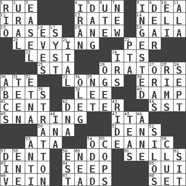 ACROSS 1. Regret 4. Goddess of spring and wife of Bragi 8. It may be bright or harebrained 12. Lyricist Gershwin 13. Assign a rank or rating to 14. 1994 drama film starring Jodie Foster 15. Fertile tracts in a desert 18. Afresh 19. Greek goddess of the earth (variant) 20. Imposing or collecting, as a tax 22. For each 23. For fear that 24. It is 25. R.R. building 26. Speakers 30. Had dinner 33. Yearns 36. One of the Great Lakes 37. Antes 39. Area sheltered from the wind 40. Moist 41. Penny 42. Prevent from occurring 44. Fast jet (abbr.) 45. Catching in a trap 47. Call ___ day 50. Santa ___, CA 51. Habitations of wild animals 53. _ moment's notice (2 wds.) 54. Pertaining to the sea 57. Scratch 59. Inside; within (prefix) 61. Makes a sale 63. To the inside or interior of 64. Ooze 65. Fr. "Yes" 66. Distinctive style or manner 67. Small amounts or degrees 68. Put into a specified state DOWN 1. River (Sp.) 2. Mountain range 3. Artist's stand 4. SW Asia republic 5. Mild oath, euphamism for damn 6. Shoshoni 7. ___ Haven, CT 8. Consumed 9. Letter starter 10. Biblical high priest 11. Insect wing 16. Nights before holidays 17. System (abbr.) 21. Slanted text style (abbr.) 22. Parent Teacher Association (abbr.) 24. Big collection agency 26. Double curve, resembling the letter S 27. Mouths or openings 28. Basketball hoops 29. Back-to-school mo. 30. Lettered men learn these first 31. Adolescent 32. Inactive volcano in Sicily 34. Cassini of fashion 35. Fish or hair follower 38. Ski resort town in Vermont 42. Heredity factor (abbr.) 43. Travel on or in a vehicle 46. _ tizzy (2 wds.) 48. Beverages made from leaves 49. Singer Murray 52. Grain storage towers 53. Opposed to 54. Wrote a lyric poem 55. 911 reaches them 56. A slight indication 57. HTML Container Element 58. Compass dir. 59. Eastern Standard Time (abbr.) 60. Teachers' org. 62. Be seated