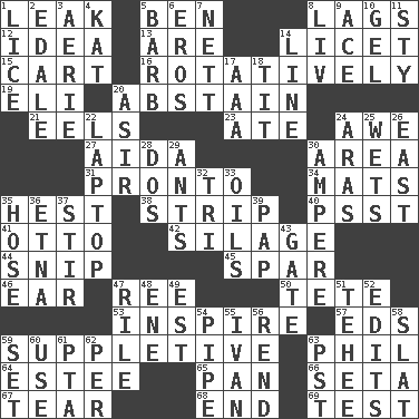ACROSS 1. Path through which fluid escapes 5. Benjamin's nick name 8. Falls behind 12. The content of cognition 13. "We ___ not amused" (Victoria) 14. It is permitted: Lat. 15. Draw slowly or heavily 16. Happening in regular succession 19. Connecticut Ivy Leaguer 20. Refrain by choice 21. Snakelike fish 23. Had dinner 24. Deep reverence 27. Opera by Verdi 30. Length times width 31. Right away 34. Floor protectors 35. Behest 38. Remove all contents or possession from 40. Inconspicuous attention getter 41. Von Bismarck 42. Fodder prepared in a silo 44. Clip 45. Practice fight 46. Hearing organ 47. To sift 50. Wig 53. Heighten or intensify 57. Begley and Asner 59. Supplying deficiencies 63. Silvers or Donahue 64. First name in cosmetics 65. Baking dish 66. Bristle 67. Pull apart 68. Conclusion 69. Trial DOWN 1. Louse (plural) 2. Peak District village in England 3. Nest on high 4. Krazy ___ of comics 5. Sharp remark 6. Greek god of love 7. Remaining after all deductions 8. 54 in ancient Rome 9. Adept person 10. Set 11. Filthy place 14. Actor's bit 17. Auto club (abbr.) 18. Teat (slang) 20. SW Saudi Arabia district 22. Portable computer 24. Caspian sea tributary 25. Soaks 26. 90 degrees 28. Two (Sp.) 29. Pismires 30. Electrical Unit 32. Three (prefix) 33. Petroleums 35. Stockings 36. Inactive volcano in Sicily 37. Agitate 39. Infant food 43. Yard entry 47. Cause heat under the collar 48. Compass dir. 49. Eastern Standard Time (abbr.) 51. Giggle 52. Prepares for publication 54. Corncob 55. "Terrible" tsar 56. Tear apart 58. Narrow board 59. Arrange properly for use 60. Purpose 61. Parent Teacher Assoc. 62. For each 63. Pacific Standard Time (abbr.)