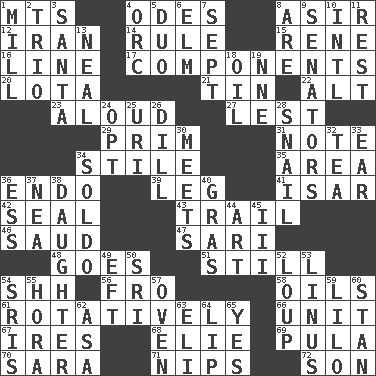 ACROSS 1. Mountains (abbr.) 4. Lyric poems 8. SW Saudi Arabia district 12. SW Asia republic 14. Governing power 15. French philosopher Descartes 16. Actor's bit 17. Pieces 20. Globular water bottle used in Asia 21. Shallow baking pan 22. The first octave above the treble staff 23. Verbally 27. For fear that 29. Demure 31. Brief written record 34. Vertical member of a panel or frame 35. Length times width 36. Inside; within (prefix) 39. Part of a journey 41. Austrian river, tributary to the Danube 42. Lick closed 43. Drop behind 46. Saudi Arabian king (1953-1964) 47. Indian skirt 48. Travels 51. Free of sound 54. Quiet! 56. Back 58. Petroleums 61. Producing rotation 66. A single undivided whole 67. Angers 68. Writer Wiesel 69. Monetary unit of Botswana 70. "Two Mules for Sister ____" 71. Cuts off 72. Male offspring DOWN 1. Place where flour is made 2. Musical group of three 3. Before Barbara or Clara 4. The grampus (Milton) 5. Superhero pair 6. Shade tree 7. Back-to-school mo. 8. "We ___ not amused" (Victoria) 9. Elected representatives 10. International (abbr.) 11. Remainder 13. Be tempered by heat 18. Petroleum 19. Compass dir. 24. Choose 25. RI univ. 26. Deli pickle 28. Slow-paced one 30. Confronts 32. Afternoon social gathering 33. Hearing organ 34. Twentieth part of a lira 36. Double-curved letter 37. Teachers' org. 38. Female child 40. Pate de foie ____ 44. Tate display 45. One more than two 49. Bank Draft (abbr.) 50. _ Lanka 52. Central Nebraska county 53. "_ and Lucy" (Charlie Brown theme song) 54. Indian titles of respect 55. Israeli folk dance 57. Baking chamber 59. _ and Stitch 60. Comedian Laurel of Laurel & Hardy 62. White ___ sheet 63. Connecticut Ivy Leaguer 64. Mouth edge 65. Affirmative reply