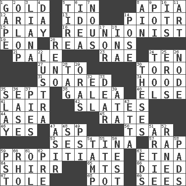 ACROSS 1. Gilt 5. Metal container 8. Capital of Western Samoa 12. Operatic vocal solo 13. Wedding promise 14. Peter (Polish) 15. Romp 16. One who advocates reunion 19. A really long time 20. Thinks logically 21. Diluted with white 23. Actress Charlotte 24. "___ Little Indians" 27. To (old English) 30. "Corrida" creature 31. Flew 34. Parka part 35. Back-to-school mo. 38. An organ shaped like a helmet 40. Otherwise 41. Den 42. Chalkboards 44. Toward the sea 45. Assign a rank or rating to 46. Consenting reply 47. Viper 50. Russian ruler of old 53. French poetic form 57. Reproach for some lapse or misdeed 59. Conciliate 63. Inactive volcano in Sicily 64. Bake eggs in their shells 65. Mountains (abbr.) 66. Passed on 67. Lacquered or enameled metalware 68. Plant holder 69. Observes DOWN 1. Stare wonderingly 2. Lowest deck of a ship 3. Woody, climbing, usually tropical plant 4. 24 hours 5. Become fatigued 6. The content of cognition 7. Horse sense 8. The 18th letter of the Arabic alphabet 9. Luau course 10. It is 11. Nonscientific branch of learning 14. Airs 17. And not 18. _ tizzy (2 wds.) 20. Former U.S. Attorney General Janet 22. A period of five years 24. Instrument 25. Greek god of love 26. Connecting point 28. Label 29. Mouths or openings 30. College papers 32. Pipe bend 33. Letter starter 35. Kill 36. Comfort 37. Sliced desserts 39. _ moment's notice (2 wds.) 43. Singer James 47. SW Saudi Arabia district 48. Put into a specified state 49. Air pressure measure (abbr.) 51. Nick name for Arthur 52. Indian princess (variant) 54. Pack (down) 55. "Tell ____ the Marines!" 56. A home for chicks 58. Writing tablets 59. Pacific Standard Time (abbr.) 60. 17th letter of the Greek alphabet 61. Lubricate 62. Before (prefix) 63. Begley and Asner