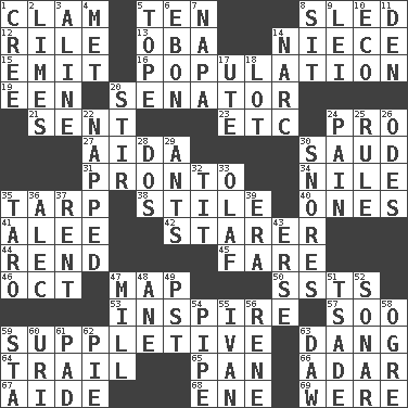 ACROSS 1. Burrowing marine mollusk 5. "___ Little Indians" 8. Downhill vehicle 12. Cause heat under the collar 13. Chief or king in Benin or Nigeria 14. Sibling's daughter 15. Give off 16. Census information 19. Car or cant ending 20. Elected representative 21. Posted 23. And so on (abbr.) 24. Adept person 27. Opera by Verdi 30. Saudi Arabian king (1953-1964) 31. Right away 34. Mediterranean tributary 35. Canvas cover 38. Vertical member of a panel or frame 40. Washington bills 41. Toward shelter 42. A viewer who gazes fixedly 44. Tear apart 45. Conductor's collection 46. Sep. follower 47. Atlas unit 50. Fast planes 53. Heighten or intensify 57. "Barney Miller" actor Jack 59. Supplementary 63. Mild oath, euphamism for damn 64. Drop behind 65. Baking dish 66. The sixth month of the Jewish calendar 67. Helper 68. Compass dir. 69. We are DOWN 1. Algonquian 2. Citrus fruits 3. Place in a line 4. Was introduced to 5. Drink excessively 6. Inky black, to poets 7. California wine valley 8. Be seated 9. Luau accessory 10. Environmental prefix 11. Lair 14. Drug cop 17. Shoshoni 18. Car dealer's back yard 20. Move through with a circular motion 22. Slept 24. Ache 25. Court order 26. Lyric poems 28. Two (Sp.) 29. Pismires 30. Sounds asleep 32. Teat (slang) 33. Norwegian king 35. Pacific island yam 36. Actor Baldwin 37. Monthly bill 39. Epoch 43. Celtic language 47. Place where flour is made 48. One (Scot) 49. Pacific Standard Time (abbr.) 51. Sadhe (variant) 52. Underwater navigation system 54. Corncob 55. _ the terrible 56. French philosopher Descartes 58. Legendary monster 59. R.R. building 60. RI univ. 61. Writing tablet 62. Sliced dessert 63. Fool