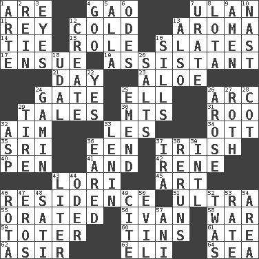 ACROSS 1. "We ___ not amused" (Victoria) 4. E Mali city 7. ____ Bator, Mongolia 11. Marina Del _, California 12. Having a low temperature 13. Scent 14. Neckwear 15. Hero or heavy, e.g. 16. Chalkboards 17. Take place subsequently 19. Aide 21. 24 hours 23. _ vera 24. Yard entry 25. Pipe bend 26. Curve 29. Stories 30. Mountains (abbr.) 31. Friend of Pooh 32. Direct toward a target or goal 33. French article 34. Baseball player Mel 35. Indian title of respect (Mr.) 36. Car or cant ending 37. From or relating to Ireland 40. Fenced enclosure 41. Added to 42. French philosopher Descartes 43. Australian parrot (variant) 45. Tate display 46. Dwelling 51. Extremist 55. Declaimed 56. "Terrible" tsar 58. Armed conflict 59. Carrier 60. Airtight sealed metal containers 61. Had dinner 62. SW Saudi Arabia district 63. Biblical high priest 64. Ocean DOWN 1. Johnson of "Laugh-In" 2. It's straight from the horse's mouth 3. Snake ____ (dice throw) 4. Thick or sticky substance 5. Silent film actress Nazimova 6. Lyric poems 7. A salt of uric acid 8. Globular water bottle used in Asia 9. So be it 10. Political cartoonist Thomas 12. Make 13. In addition 16. Beverly of Met fame 18. Freehold land 20. Table seasonings 22. It is so 24. Homeless child 25. Make improvements or corrections to 26. Came up 27. Writer of Portnoy's Complaint (1969) 28. Small bed 29. Hoop that covers a wheel 32. Cleo's killer 33. Soviet premier 1918-24 36. Having ears or earlike features 37. Lyricist Gershwin 38. Summer TV shows 39. International (abbr.) 43. 61 cubic inches 44. Baltic tributary 46. Roll call or roster of names 47. Greek god of love 48. Suttee (variant) 49. Quote 50. Morally bad or wrong 52. It was, poetically 53. Pace 54. Length times width 57. Black tropical American cuckoo