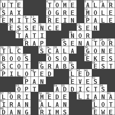 ACROSS 1. Shoshoni 4. Heavy book 8. Having or resembling wings 12. Saxophone 13. Legendary monster 14. Undercover agent 15. Sends forth 18. It's straight from the horse's mouth 19. Diluted with white 20. Gist 22. Elected rep. 23. Jacques of French films 24. Not either 25. Hit sharply and swiftly 26. Legislator 30. Affectionate concern, for short 33. Any of the three canals of the cochlea 36. Went 37. Scornful sounds 39. Bear (Spanish) 40. Supplements with great effort 41. Native of Scotland 42. Seizes 44. Eastern Standard Time (abbr.) 45. Manned the helm 47. Directed 50. Baking dish 51. Nights before holidays 53. Elect 54. Inveterate users 57. Australian parrot (variant) 59. Ancient Persian 61. Woody, climbing, usually tropical plant 63. SW Asia republic 64. ____ Jay Lerner 65. Car dealer's back yard 66. Mild oath, euphamism for damn 67. Basketball hoops 68. She-sheep DOWN 1. Purpose 2. Not wild 3. Be 4. Torque (variant) 5. Double curve, resembling the letter S 6. Medical imaging device (abbr.) 7. Car or cant ending 8. Electrical Measurement 9. Grant temporary use of 10. Everything 11. To sift 16. Russian ruler of old 17. Stalk of a moss capsule 21. Pinches, bites 22. Manchild 24. Teachers' org. 26. Messy guy 27. Casino tip 28. Washington bills 29. Take ten 30. Cook's measure (abbr.) 31. Venues 32. Calm and collected 34. Drawstring 35. White ___ sheet 38. Halting 42. Commissioned military rank (abbr.) 43. Downhill vehicle 46. Make lace 48. Morally bad or wrong 49. Tenth: prefix 52. Having lost freshness 53. NW Algerian seaport 54. First man 55. Hiding places for outlaws 56. Overwhelm 57. Flaplike covering 58. Mouth or opening 59. Spoil 60. Connecticut Ivy Leaguer 62. Had dinner