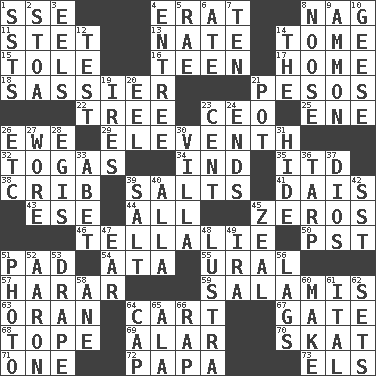 ACROSS 1. Compass dir. 4. Part of Q.E.F. 8. Tired old horse 11. Proofreading order 13. Nathan's nickname 14. Heavy book 15. Lacquered or enameled metalware 16. Adolescent 17. Residence 18. More impudent 21. Mexican monetary units 22. Family _ (genealogy) 23. Corporate head (abbr.) 25. Compass dir. 26. She-sheep 29. Veterans Day date 32. Ancient Roman robes 34. Working for oneself (abbr.) 35. It would 38. Baby bed with high sides 39. Table seasonings 41. Raised platform 43. Compass dir. 44. 100% 45. Nothings 46. Copy Pinocchio 50. Pacific Standard Time (abbr.) 51. Groovy apt. 54. _ moment's notice (2 wds.) 55. Mountain range 57. Ethiopian city, capital of Harari 59. Deli grouping 63. NW Algerian seaport 64. Heavy open wagon 67. Yard entry 68. Drink excessively 69. Having or resembling wings 70. Three-handed card game 71. Single 72. Dad 73. Raised railways DOWN 1. Fast planes 2. Portico 3. Snakelike fish 4. Main course 5. Actress Charlotte 6. Had dinner 7. Nine, plus one 8. Trap for birds or small mammals 9. ID or VA city 10. Honkers 12. Trial 14. Definite Article 19. Angers 20. Snakelike fish 21. Plant holder 23. Penny 24. Extremities 26. And so on (abbr.) 27. Had on 28. The front part of a cuirass 30. Country estate 31. Flintstone garb 33. Collude with 36. Canvas cover 37. "Vaya con ____" 39. Table seasoning 40. Silent film actress Nazimova 42. Fast jet (abbr.) 45. Ardor 47. Hearing organ 48. A period of five years 49. Lyricist Gershwin 51. Picture 52. Composer Copland 53. Window treatment 56. Fails to keep up a pace 58. A saturated hydrocarbon 60. Cause to be 61. Slanted text style (abbr.) 62. Puts into a specified state 64. Head covering 65. According to 66. Strike