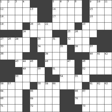 ACROSS 1. Pulitzer Prize-winning author Ferber 5. Singer James 9. Definite Article 12. Memorize 14. Peachy ____! 15. To riddle 16. Before Barbara or Clara 17. Inactive volcano in Sicily 18. Boat paddle 19. Epoch 20. Went by 23. Actor Griffith 24. Indonesian resort city 25. Comfort 27. Lie 30. Conclude 32. Pass on 33. Soon (poet.) 34. Armor plate that protects the chest 36. Tired old horse 38. Set 39. Eastern Standard Time (abbr.) 40. _ moment's notice (2 wds.) 43. Mouth edge 46. Scram, to a cat 48. Thailand, formerly 49. "Barney Miller" actor Jack 51. _ Lanka 52. Pack (down) 53. Den 54. Whirlpool 56. SW Saudi Arabia district 58. Main course 61. Arrange properly for use 64. 54 in ancient Rome 65. Thick slice 66. New (sp.) 68. Single 69. Fast planes 70. Lag or linger behind 71. Car or cant ending 72. Shed a tear 73. Small island DOWN 1. Otherwise 2. Letter starter 3. Grandmother 4. Tate display 5. Supplements with great effort 6. False hair 7. Looked after 8. Santa ___, CA 9. Heavy duty weighing machine 10. Froth on beer 11. Suggestive of the supernatural 13. California wine valley 21. Toward shelter 22. Burns superficially 23. Toward the sea 24. Benjamin's nick name 26. The 18th letter of the Arabic alphabet 27. Label 28. A saturated hydrocarbon 29. Hang loosely or laxly 31. Plates 35. A viewer who gazes fixedly 37. Greek goddess of the earth (variant) 41. Scottish cap 42. Electrical Unit 44. Austrian river, tributary to the Danube 45. Luau course 47. Periodic rise and fall of the sea level 48. Filthy place 50. Threatening words 53. Make or become more lively 55. Scratch 56. Medicinal plant 57. Trig term 59. Nathan's nickname 60. Cook's measure (abbr.) 61. Oceans 62. Tending to cause great harm 63. Lacquered or enameled metalware 65. Compass dir. 67. RI univ.