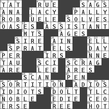 ACROSS 1. Make lace 4. Regret 7. Settles 11. Santa ___, CA 12. Made of lace 13. Friendly 14. Director Reiner 15. Ubangi River tributary 16. Finds the solution 17. Fertile tracts in a desert 19. Aide 21. Mountains (abbr.) 23. Ripens 24. The founder of a family 25. The 18th letter of the Arabic alphabet 26. Pipe bend 29. Small fatty European fish 30. Raised railways 31. 24 hours 32. For each 33. Big collection agency 34. Compass dir. 35. The 19th letter of the Greek alphabet 36. _-fi 37. Lean end of the neck 40. "We ___ not amused" (Victoria) 41. Area sheltered from the wind 42. Ancient Greek god of war 43. Examine hastily 45. Fenced enclosure 46. Decision 51. Goodbye (Sp.) 55. Foolish or stupid persons 56. Dunce 58. Affectionate concern, for short 59. Impressive in appearance 60. Singer Brickell 61. Corporate head (abbr.) 62. Celtic language 63. Portuguese money of account (variant) 64. Being at a high temperature DOWN 1. Edible starchy tuberous root 2. Small Philippine buffalo 3. Bar bills 4. Actress Charlotte 5. Southern CA. univ. 6. Snake ____ (dice throw) 7. Table seasonings 8. Inventor's middle name 9. Small, secluded valley 10. System (abbr.) 12. A period of five years 13. Introduce or present, as a question 16. Omens 18. Arab leader 20. Moves on water 22. Put into a specified state 24. Disorder 25. Nest on high 26. Ferber et al. 27. Long (Scottish) 28. Sodium hydroxide 29. Dry up 32. Parent Teacher Association (abbr.) 33. Ancient Celtic tribe of eastern Britain 36. Narrow boards 37. Plant excrement 38. Cause to be 39. Tear apart 43. Fur scarf 44. Quote 46. Trig term 47. Aroma 48. Chest bones 49. River in Europe 50. Connecting point 52. Hankering 53. Butter sub 54. Native of Scotland 57. Whopper