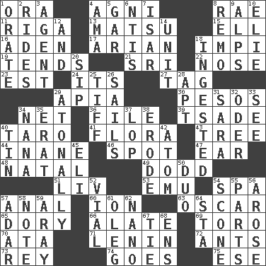 ACROSS 1. Mouth or opening 4. Hindu god of fire 8. Actress Charlotte 11. Capital of Latvia 13. Taiwanese island in East China Sea 15. Pipe bend 16. Arabian gulf 17. Believer in; advocate of (suffix) 18. Body of Kaffir warriors 19. Watches over 21. Indian title of respect (Mr.) 22. Sense of smell 23. Eastern Standard Time (abbr.) 24. ___ a Wonderful Life 27. Label 29. Capital of Western Samoa 30. Mexican monetary units 34. Fish or hair follower 36. Do some clerical work 39. Sadhe (variant) 40. Edible starchy tuberous root 41. Plants 43. Woody plant 44. Silly 46. Specific locale 47. Ewer handle 48. Relating to or accompanying birth 49. Texas town _ City 51. 54 in ancient Rome 53. Australian flightless bird 54. Health resort 57. Of or related to the anus 60. Electrically charged atom 63. Witty Wilde 65. Rowboat 66. Having winglike extensions 69. "Corrida" creature 70. _ moment's notice (2 wds.) 71. Soviet premier 1918-24 72. Pismires 73. Marina Del _, California 74. Leaves 75. Compass dir. DOWN 1. Speak pompously 2. Amusement-park features 3. Rep 4. Nanny (var.) 5. Slender fish 6. Nuclear Threat Initiatives 7. Austrian river, tributary to the Danube 8. San ____ (Riviera town) 9. High mountains 10. Writer Wiesel 12. Also 14. A single undivided whole 18. Swallowed 20. Small drink 25. Small quarrel 26. Moves on water 28. Fitting 29. Without tonality 31. "Two Mules for Sister ____" 32. River in Europe 33. Perceive with the eye 34. Nanny 35. Part of Q.E.F. 37. Chop off 38. Eat (away) 40. Shallow baking pan 42. Smallest unit of an element 45. Biblical high priest 50. Superhero pair 52. Small bottle 54. Biscuitlike quick bread 55. Pieces 56. Came up 57. The sixth month of the Jewish calendar 58. Short letter 59. Like ___ of sunshine 61. Cassini of fashion 62. Billionth: prefix 64. R.R. building 67. Make a knot 68. Followers of ems