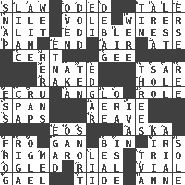 ACROSS 1. Cole _ (cabbage dish) 5. Wrote a lyric poem 9. Lie 13. "Death on the ____" 14. Grand slam 15. One who wires 16. Set down 17. The property of being fit to eat 19. Baking dish 20. Conclude 21. Wind 22. Had dinner 23. An absolute certainty 25. Unit of force equal to gravity 26. Related on the mother's side 30. Russian ruler of old 34. Swept the length of 35. Opening into or through something 36. Shade of tan 39. White American of non-Hispanic descent 42. Hero or heavy, e.g. 43. Connect, as a bridge 44. Nest on high 46. Plant excrements 47. Break or tear apart 48. Greek goddess of the dawn 51. "____ silly question..." 54. Away 57. Separate the seeds from cotton 58. Storage container 60. Big collection agency 62. Frustrating wastes of time 65. Musical group of three 66. Stared at amorously 67. Monetary unit of Yemen 68. Small bottle 69. Highlander 70. Event that recurs at intervals 71. Queen of England 1702-14 DOWN 1. Fastener 2. Pale purple color 3. Place in a line 4. Dripping 5. Baking chamber 6. Texas town _ City 7. Connecticut Ivy Leaguer 8. Debunk (Brit. slang) 9. Metal container 10. Length times width 11. For fear that 12. Celtic language 15. Past tense of be (plural) 18. Whopper 20. Inactive volcano in Sicily 24. Summer TV shows 27. Alias (abbr.) 28. "___ Little Indians" 29. _ Allan Poe 30. Triads 31. "Barney Miller" actor Jack 32. Everything 33. To separate or throw off 36. Curvy letter 37. Numbers guy (abbr.) 38. Hit sharply and swiftly 40. Area sheltered from the wind 41. Mouth or opening 45. "Terrible" tsar 48. Mild oath 49. Boat paddle 50. Derisive sound 52. Japanese brewing company 53. Believer in; advocate of (suffix) 54. Tree-dwelling hopper 55. Port city in Latvia 56. Stare 58. Necklace unit 59. Capri or Wight 61. Flatfish 63. Cartoonist voice _ Blanc 64. Cards in a Roman deck? 65. Federal power corp.