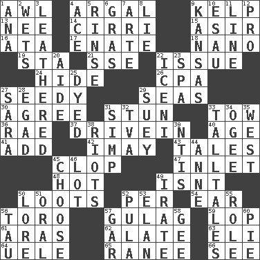 ACROSS 1. Leather borer 4. Therefore, facetiously 9. Seaweed 13. Born 14. High-altitude cloud 15. SW Saudi Arabia district 16. "One Day ___ Time" 17. Related on the mother's side 18. Billionth: prefix 19. R.R. building 21. Compass dir. 22. Come out of 24. Flintstone garb 26. Tax preparer (abbr.) 27. Sleazy 29. Oceans 30. Match 31. Surprise greatly 33. Pull behind 36. Actress Charlotte 37. Popular '50s hangout 40. Mature 41. Increase 42. "If ____ say so..." 43. Falsehoods 45. Hoof sound 47. An arm off of a larger body of water 48. Being at a high temperature 49. Is not 50. Plunders 52. For each 54. Hearing organ 56. "Corrida" creature 57. POW camp 59. Chop off 61. Caspian sea tributary 62. Having winglike extensions 63. Connecticut Ivy Leaguer 64. Ubangi River tributary 65. The wife of a rajah (variant) 66. Observe DOWN 1. Santa ___, CA 2. Soaks 3. Resembling or made to resemble leather 4. Adept person 5. Remove soap 6. Pate de foie ____ 7. Johnson of "Laugh-In" 8. Untruth 9. Sunflower state 10. Son of Isaac 11. Actor's bit 12. Adept person 20. Helper 22. Ancient Celtic tribe of eastern Britain 23. Health resort 25. Colored 27. "Two Mules for Sister ____" 28. Mild oath 29. Chop _ 31. Simple or foolish person 32. Federal power corp. 33. Baron Munchausen's specialties 34. Double curve, resembling the letter S 35. Compass direction 38. Disturbances 39. Nuclear Threat Initiatives 44. Queen of England 1702-14 45. Opt 46. Car dealer's back yard 49. Feeling or showing extreme anger 50. Old wives' tales, e.g. 51. Taken by mouth 52. Monetary unit of Botswana 53. Liveliness 55. Hero or heavy, e.g. 56. The 19th letter of the Greek alphabet 57. Slender fish 58. Unit of force equal to gravity 60. Sliced dessert