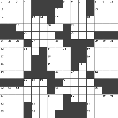 ACROSS 1. Hollow 5. Raised railways 8. Leather borer 11. Type of rug 12. 480, 500 or 516 sheets of paper 13. Area sheltered from the wind 14. Hyrax 17. Event 19. Looked after 21. Chooses 22. (Had) reclined 23. Elected rep. 24. Apple computer (short form) 27. Remaining after all deductions 29. Keyboard key 32. Speak pompously 34. To riddle 36. Falsehood 37. Grain storage tower 38. Curvy letter 39. Silent film actress Nazimova 40. Highlander 41. And so on (abbr.) 42. Perfect 43. Rowing implement 44. Settles 46. A female animal or person 47. Parent Teacher Assoc. 50. Hero or heavy, e.g. 52. A viewer who gazes fixedly 55. Seem 57. Newsperson 59. Disco prop 62. It is 63. Drop; flow; fall 64. Nights before holidays 65. Observe 66. Snakelike fish 67. Incision DOWN 1. Possessed 2. Mouth or opening 3. For fear that 4. Artist's stand 5. Car or cant ending 6. Shoestrings 7. Grin 8. Actor Baldwin 9. Left 10. Allows 12. To free from 15. Empty; void 16. Singer Brickell 18. Lair 20. Main course 24. With motion or animation 25. N. Chile seaport 26. Bodily heat indicating an inflammation 28. Trials 29. Stories 30. Assad's deity 31. Memphis, Tenn. Street 33. Small child 35. Fortification 36. Small amount or degree 42. Small island 45. Republicans 47. Adept person 48. Laconic 49. Nick name for Arthur 51. Having ears or earlike features 52. Indian titles of respect 53. False hair 54. Domed church section 55. "We ___ not amused" (Victoria) 56. Be footloose 58. Pipe bend 60. Benjamin's nick name 61. Eastern Standard Time (abbr.)