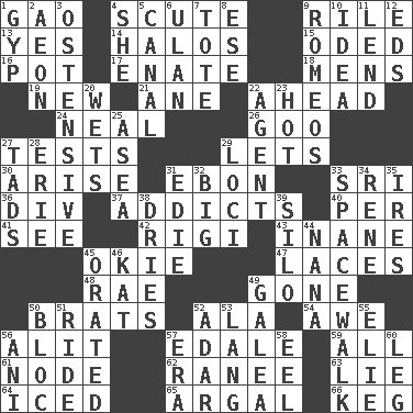 ACROSS 1. E Mali city 4. Snake scale 9. Cause heat under the collar 13. Affirmative reply 14. Rings 15. Wrote a lyric poem 16. Cooking vessel 17. Related on the mother's side 18. Not women's 19. ___ Haven, CT 21. One (Scot) 22. Forward in time 24. Anneal 26. Thick or sticky substance 27. Trials 29. Allows 30. Ascend 31. Inky black, to poets 33. _ Lanka 36. HTML Container Element 37. Inveterate users 40. For each 41. Perceive with the eye 42. Swiss mountan, "Queen of the Mountains" 43. Empty; void 45. Migrant worker of the '30s 47. Shoestrings 48. Actress Charlotte 49. Went 50. Naughty children 52. Chicken ___ king 54. Deep reverence 56. Came down and settled, as after flight 57. Peak District village in England 59. Everything 61. Connecting point 62. The wife of a rajah (variant) 63. Untruth 64. On the rocks 65. Therefore, facetiously 66. Barrel DOWN 1. Swindle 2. Age 3. Clearly or manifestly demonstrative 4. A female animal or person 5. Lessep's creation 6. Uhlan (variant) 7. Carryall 8. Compass dir. 9. Lover boys 10. The content of cognition 11. Grant temporary use of 12. Begley and Asner 20. Moistens 22. Rep 23. Being at a high temperature 25. Toward the sea 27. Small boys 28. One of the Great Lakes 29. Venues 31. Singer Brickell 32. Of large size 33. High altitude stroll 34. French philosopher Descartes 35. Angers 38. Frees from moisture 39. Grain storage tower 44. Nanny 45. Spoke pompously 46. Krazy ___ of comics 49. An organ shaped like a helmet 50. Alliance 51. Travel on or in a vehicle 52. The sixth month of the Jewish calendar 53. Austrian-born American filmmaker Fritz 55. Writer Wiesel 56. Cuckoo 57. Epoch 58. Snakelike fish 60. Part of a journey