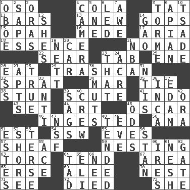 ACROSS 1. Bear (Spanish) 4. Root beer relative 8. Make lace 11. Long, evenly shaped pieces 13. Afresh 14. Republicans 15. Brightly colored fish 16. Ancient Persian 17. Operatic vocal solo 18. Center 21. Wanderer 22. Shrivel 23. Bar bill 25. Compass dir. 26. Erode 29. File 13 32. Small fatty European fish 34. Impair 35. Neckwear 38. Make senseless or dizzy 39. Turtle shell scale 41. Southeast Asian peninsula 43. Arrange properly for use 44. Nonscientific branch of learning 45. Witty Wilde 46. Swallowed 50. Nanny (var.) 51. Eastern Standard Time (abbr.) 54. Compass dir. 55. Nights before holidays 57. Bundle of cut stalks of grain 59. Inhabiting a nest 63. Torque (variant) 64. Look after 67. Type of rug 68. Celtic language 69. Toward shelter 70. Egg locale 71. Perceive with the eye 72. Passed on 73. A female animal or person DOWN 1. Mitch Miller's instrument 2. Plant excrements 3. Mouths or openings 4. Device for capturing images 5. Single 6. Directed 7. Deep reverence 8. Singer Mel 9. Bee-related 10. Sadhe (variant) 12. "______ My Girl" (Turtles hit) 14. E Mali city 19. Remaining after all deductions 20. 4-wheeled motor vehicle 21. Basketball assoc. 23. Not this but _ 24. 1/640 square mile 26. Double-curved letter 27. Flats, for short 28. Loyal 30. Obscenities 31. Nuclear Threat Initiatives 33. Against 36. South American Indian 37. Dutch treat 39. Droops 40. Ship's personnel 42. Mouth or opening 45. Lyric poems 47. Science/research agcy. 48. Watched over 49. First lady 51. _____ Park, CO 52. Dinah or Pauly 53. Laconic 56. Comedian Laurel of Laurel & Hardy 58. Adept person 60. Angers 61. Soft 62. Yard entry 64. Small amount or degree 65. Biblical high priest 66. Born