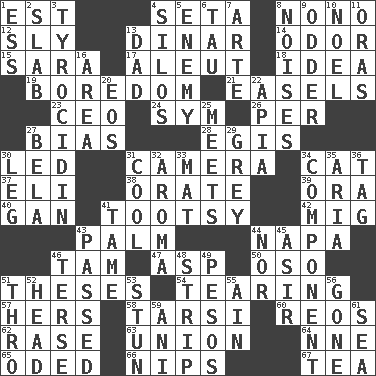 ACROSS 1. Eastern Standard Time (abbr.) 4. Bristle 8. Words to Nanette 12. Insidious 13. Middle Eastern gold or silver currency 14. Scent 15. "Two Mules for Sister ____" 17. Eskimo relative 18. The main thing one is thinking about 19. Mood resulting from idleness 21. Artist's stands 23. Corporate head (abbr.) 24. Symbol (abbr.) 26. For each 27. Prejudice 28. Armor plate that protects the chest 30. Directed 31. Device for capturing images 34. Domesticated feline 37. Connecticut Ivy Leaguer 38. Declaim 39. Mouth or opening 40. Separate the seeds from cotton 41. Tootsie (variant) 42. Russian fighter aircraft 43. Inside of hand 44. California wine valley 46. Scottish cap 47. Cleo's killer 50. Bear (Spanish) 51. College papers 54. Separating forcefully 57. Possessive pronoun 58. Tarsus (plural) 60. Vintage cars 62. To erase 63. The state of being joined or united 64. Compass dir. 65. Wrote a lyric poem 66. Pinches, bites 67. Beverage made from leaves DOWN 1. Double-curved letter 2. Thick slice 3. Polypeptide antibiotic 4. Grain storage towers 5. Foe 6. The 19th letter of the Greek alphabet 7. Johnson of "Laugh-In" 8. Annoying sounds 9. More peculiar 10. Christmas carol 11. Mouths or openings 13. Male parent 16. Length times width 20. Greek goddess of the dawn 22. Capital of Western Samoa 25. Confronts 27. Actor Lugosi 29. Jennifer or Joel 30. Part of a journey 31. Calm and collected 32. Odor 33. Floor protector 34. Piece 35. Roberta Peters solo 36. Label 41. Not wild 43. Went by 44. Or not 45. SW Saudi Arabia district 46. Laconic 48. Long narrow piece of something 49. Mexican monetary units 51. Through, poetically 52. Froth on beer 53. Astound 55. The 18th letter of the Arabic alphabet 56. Went 59. Cuckoo 61. Ocean