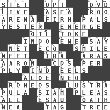 ACROSS 1. Proofreading order 5. Choose 8. Movie disc 11. Not recorded 12. At sea 14. Friend of Pooh 15. Sports stadium 17. Securely fixed in place 18. Friends 19. Of or pertaining to yesterday 21. Develop 23. Lubricate 25. Puff or smoke 26. Southeast Asian peninsula 27. Compass dir. 28. Declare 31. Fish or hair follower 33. Environmental prefix 35. Grin 37. Rendezvous 38. Lyricist Gershwin 40. Ancient river in northeast Turkey 41. Composer Copland 43. Music discs 45. For each 46. Strand of rope, yarn or thread 47. Indiana (abbr.) 50. Snakelike fish 52. _ vera 53. Modern: prefix 54. Lover boys 56. A period of five years 61. Monetary unit of Botswana 62. Thailand, formerly 65. Entreaties 66. Everything 67. Son of Isaac 68. Pledge 69. Teachers' org. 70. Label 71. Relationship diagram DOWN 1. Kill 2. Hoop that covers a wheel 3. Nights before holidays 4. Portable shelter 5. Clumsy lout 6. Air pressure measure (abbr.) 7. Cigar-shaped 8. To be drawn or hauled along 9. Short-tailed, large-bodied rat 10. Two (Sp.) 13. ID or VA city 16. Period of immesurable duration 18. Before (prefix) 20. Travel on or in a vehicle 22. Makes supply last 24. Venues 26. "Tell ____ the Marines!" 28. Title for a man of rank and authority 29. Having or resembling wings 30. It is so 31. Be tempered by heat 32. Suggestive of the supernatural 34. The grampus (Milton) 36. Atlas contents 37. Atlas unit 39. An important port of Yemen 42. Mediterranean tributary 44. Stitch closed the eyes of (a falcon) 48. Trap for birds or small mammals 49. Stop 51. Central Nebraska county 52. Nanny (var.) 54. Court order 55. Rounded earthenware pot or jar 57. Position in a hierarchy or organization 58. Separate forcefully 59. Pace 60. American tennis player Robert 61. Baking dish 63. American Automobile Association (abbr.) 64. Java container