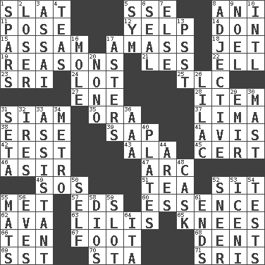 ACROSS 1. Narrow board 5. Compass dir. 8. Black tropical American cuckoo 11. Introduce or present, as a question 12. Sharp bark 14. Spanish title 15. Indian state 17. Collect or gather 18. Type of plane 19. Thinks logically 21. French article 22. Pipe bend 23. _ Lanka 24. Car dealer's back yard 25. Affectionate concern, for short 27. Compass dir. 28. A whole individual unit 31. Thailand, formerly 35. Mouth or opening 37. Pale green bean 38. Celtic language 39. Plant excrement 41. Opinion 42. Trial 43. Wing 45. Foregone conclusion 46. SW Saudi Arabia district 47. Curve 49. Mayday 51. Afternoon social gathering 52. Be seated 55. Was introduced to 57. Begley and Asner 60. Center 62. Actress Gardner 63. Ms. Damita and namesakes 65. Leg joints 66. "___ Little Indians" 67. 12 inches 68. Scratch 69. Fast jet (abbr.) 70. R.R. building 71. Indian titles of respect DOWN 1. Practice fights 2. Failure 3. Slender Brazilian palm 4. Afternoon social gatherings 5. Symbol (abbr.) 6. Lick closed 7. Otherwise 8. Descriptive word 9. Christmas carol 10. International (abbr.) 13. Inconspicuous attention getter 16. Undercover agent 17. Michaelmas daisies 20. Words to Nanette 26. Pale purple color 29. Arab leader 30. Vertical spar for supporting sails 31. Stalk of a moss capsule 32. Angers 33. Helper 34. Paris' subway 36. Auto club (abbr.) 40. Food holders 44. Ancient Greek god of war 48. Keg 50. Oneself 52. Contemptuous expression 53. Ancient Celtic tribe of eastern Britain 54. Trials 55. Floor protectors 56. Nights before holidays 58. "Vaya con ____" 59. Notch 61. Extremities 64. Call ___ day
