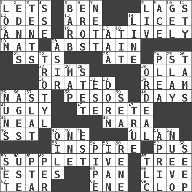 ACROSS 1. Allows 5. Benjamin's nick name 8. Falls behind 12. Lyric poems 13. "We ___ not amused" (Victoria) 14. It is permitted: Lat. 15. Singer Murray 16. Producing rotation 19. Floor protector 20. Refrain by choice 21. Fast planes 23. Had dinner 24. Pacific Standard Time (abbr.) 27. Basketball hoops 30. Water jar 31. Spoke pompously 34. 480, 500 or 516 sheets of paper 35. Political cartoonist Thomas 38. Mexican monetary units 40. 24-hour periods 41. Unsightly 42. Cigar-shaped 44. Actress Patricia 45. Hindu Mythology: god of death 46. Fast jet (abbr.) 47. Single 50. Uhlan (variant) 53. Heighten or intensify 57. Ichor 59. Supplementary 63. Woody plant 64. _____ Park, CO 65. Baking dish 66. Not recorded 67. Separate forcefully 68. Compass dir. 69. Hoof sound DOWN 1. Rich soil 2. Ferber et al. 3. Portable shelters 4. Compass dir. 5. Sharp remark 6. Greek god of love 7. Remaining after all deductions 8. 54 in ancient Rome 9. Adept person 10. Set 11. Filthy place 14. Actor's bit 17. American Automobile Association (abbr.) 18. Teat (slang) 20. SW Saudi Arabia district 22. Trinitrotoluene 24. Entreaty 25. Kill 26. Scottish caps 28. Atlas unit 29. Proofreading order 30. Severe or trying experience 32. Compass dir. 33. Dormintory (informal) 35. Religious women 36. Eons 37. Narrow board 39. Ocean 43. Loyal 47. Lubricates 48. Compass dir. 49. Eastern Standard Time (abbr.) 51. Showery time 52. New (sp.) 54. Corncob 55. "Terrible" tsar 56. French philosopher Descartes 58. Ooze 59. Put into a specified state 60. Purpose 61. Parent Teacher Assoc. 62. For each 63. Affectionate concern, for short