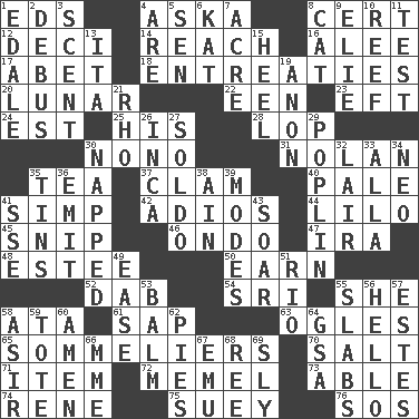 ACROSS 1. Begley and Asner 4. "____ silly question..." 8. An absolute certainty 12. Tenth: prefix 14. Arrive at 16. Toward shelter 17. Collude with 18. Pleas 20. Type of eclipse 22. Car or cant ending 23. Lizard (obsolete) 24. Eastern Standard Time (abbr.) 25. Part of HMS, perhaps 28. Chop off 30. Words to Nanette 31. Pitcher Ryan 35. Afternoon social gathering 37. Dollar (slang) 40. Light colored 41. Simple or foolish person 42. Goodbye (Sp.) 44. _ and Stitch 45. Sever or remove by pinching or nipping 46. Southwest Nigerian state 47. Retirement account (abbr.) 48. First name in cosmetics 50. Merit 52. Apply (a substance) by light strokes 54. Indian title of respect (Mr.) 55. A female animal or person 58. _ moment's notice (2 wds.) 61. Plant excrement 63. Stares 65. Wine waiters 70. Table seasoning 71. A distinct part 72. Klaipeda city 73. Competent 74. French philosopher Descartes 75. Chop _ 76. Distress signal DOWN 1. Peak District village in England 2. Alight from a bus 3. Aroma 4. "We ___ not amused" (Victoria) 5. Elected rep. 6. Krazy ___ of comics 7. Measure of real estate 8. Domesticated feline 9. Writer Wiesel 10. Coral collection 11. Trial 13. Call ___ day 15. Person who is morally reprehensible 19. Soon (poet.) 21. 17th letter of the Greek alphabet 26. South American Indian 27. Twentieth part of a lira 29. Cotton for raincoats, e.g. 30. Slept 32. Den 33. Silent film actress Nazimova 34. Modern: prefix 35. Metal containers 36. Send forth 38. The 18th letter of the Arabic alphabet 39. Methods 41. Compass dir. 43. Fly high 49. Comfort 51. _ de Janeiro 53. Lip ointment 55. Thick slices 56. Phone greeting 57. _____ Park, CO 58. SW Saudi Arabia district 59. Carry 60. So be it 62. Sliced desserts 64. Girls' org. (abbr.) 66. Madame (abbr.) 67. Australian flightless bird 68. To riddle 69. Cunning