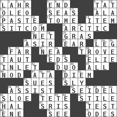 ACROSS 1. Cowardly lion portrayer 5. Conclude 8. Make lace 11. Butter sub 12. Oceans 14. According to 15. Thick mixture 17. Heavy book 18. A distinct part 19. "Cheers" or "Ellen" 21. Northern region 23. Fish or hair follower 25. Pate de foie ____ 26. SW Saudi Arabia district 27. Hearing organ 28. Part of a journey 31. Distant 33. Teachers' org. 35. Collection of objects 37. Tense 38. Begley and Asner 40. Writer Wiesel 41. An arm off of a larger body of water 43. Superhero pair 45. Everything 46. Lower and raise head in agreement 47. _ moment's notice (2 wds.) 50. South Vietnam president (1954) 52. Takes to court 53. Stealthy 54. Aid 56. A glass for beer 61. _ gin 62. Wig 65. Vertical member of a panel or frame 66. Actor Linden 67. Indian titles of respect 68. Trial 69. Compass dir. 70. Observe 71. Lyric poems DOWN 1. Chops off 2. Jai ____ 3. Behest 4. College mil. group 5. Eastern Standard Time (abbr.) 6. Modern: prefix 7. Break 8. Jacques of French films 9. Actor Baldwin 10. Scottish cap 13. Father Junipero _ 16. Immeasurably long periods of time 18. It is 20. Count _ (2 wds.) 22. Haul 24. Woody plant 26. Johnson of "Laugh-In" 28. Hang loosely or laxly 29. Morally bad or wrong 30. Unit of force equal to gravity 31. Papal veil 32. Old (Scot.) 34. Increase 36. 480, 500 or 516 sheets of paper 37. Metal container 39. Beer foam 42. "Change" in Tahitian 44. Lubricates 48. Trials 49. Michaelmas daisies 51. Snake ____ (dice throw) 52. Compass dir. 54. ____ Jay Lerner 55. Flatfish 57. "Tell ____ the Marines!" 58. Passed on 59. Otherwise 60. Allows 61. A female animal or person 63. Make a knot 64. Compass dir.