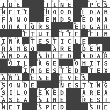 ACROSS 1. Binary compound 4. Prong on a fork 8. Personal Computers (abbr.) 11. Remaining after all deductions 13. Parka part 14. Rich soil 15. Papal veil 16. Extremities 17. Pulitzer Prize-winning author Ferber 18. Speakers 21. _ Allan Poe 22. Needle case 23. Make a knot 25. Shade tree 26. _ tizzy (2 wds.) 29. One of the two male reproductive glands 32. Role for Stallone 34. "We ___ not amused" (Victoria) 35. Lair 38. Small Philippine buffalo 39. Having a sole or soles 41. The sixth month of the Jewish calendar 43. Petroleum 44. Mature 45. Leaves out 46. Eaten 50. John Ritter's dad 51. Black tropical American cuckoo 54. Compass dir. 55. Nights before holidays 57. Something which is sent 59. Inhabiting a nest 63. Grain storage tower 64. Supplemented with great effort 67. Type of rug 68. At sea 69. Trig term 70. Relief 71. Was introduced to 72. Drove too fast 73. A female animal or person DOWN 1. A message received and understood 2. Letter starter 3. Inactive volcano in Sicily 4. College paper 5. Electrically charged atom 6. Allow head to fall sleepily 7. Begley and Asner 8. Plash 9. Lessep's creation 10. Excessive but superficial compliments 12. Carryall 14. Directed 19. Von Bismarck 20. Sorrow 21. Snakelike fish 23. Become fatigued 24. On the rocks 26. Retirement account (abbr.) 27. Billionth: prefix 28. Mine, in Marseilles 30. Stories 31. Dutch treat 33. Indonesian resort city 36. Prepare for publication 37. Nathan's nickname 39. Sinks 40. Double curve, resembling the letter S 42. Acura sports coupe 45. Lyric poems 47. Born 48. Watched over 49. Night before a holiday 51. Indian state 52. Annoying sound 53. An arm off of a larger body of water 56. Play the lead 58. ___ good deed 60. Angers 61. Delicate 62. Yard entry 64. Double-curved letter 65. Sleep 66. Compass dir.