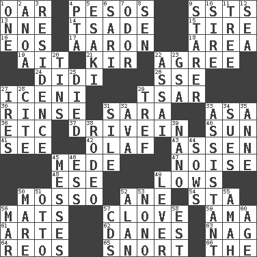 ACROSS 1. Boat paddle 4. Mexican monetary units 9. Fast planes 13. Compass dir. 14. Sadhe (variant) 15. Hoop that covers a wheel 16. Greek goddess of the dawn 17. Composer Copland 18. Type of rug 19. Small island 21. Apertif with cassis 22. Match 24. "You Light Up My Life" star Conn 26. Compass dir. 27. Ancient Celtic tribe of eastern Britain 29. Russian ruler of old 30. Wash lightly 31. "Two Mules for Sister ____" 33. White ___ sheet 36. And so on (abbr.) 37. Popular '50s hangout 40. Player for Phoenix 41. Observe 42. Norwegian king 43. NE Netherlands city 45. Ancient Persian 47. Annoying sound 48. Compass dir. 49. Moos 50. With motion or animation 52. A saturated hydrocarbon 54. R.R. building 56. Floor coverings 57. Garlic unit 59. Housemaid (var.) 61. Johnson of "Laugh-In" 62. Natives or inhabitants of Denmark 63. Tired old horse 64. Vintage cars 65. Derisive sound 66. Definite Article DOWN 1. Single 2. Small Philippine buffalo 3. Dwelling 4. Parent Teacher Association (abbr.) 5. 1973 Nobel Price Winner (Physics) Leo 6. Indian skirt 7. Aroma 8. Elected rep. 9. A viewer who gazes fixedly 10. Beget 11. Family _ (genealogy) 12. Ocean 20. Airtight sealed metal containers 22. Slender Brazilian palm 23. Girls' org. (abbr.) 25. Passed on 27. Angers 28. Quote 29. Not kosher 31. Filth; sediment 32. Actress Gardner 33. Aide 34. Takes to court 35. Singer Murray 38. Cowboy competition 39. Billionth: prefix 44. Sty mamas 45. Makes clutter 46. Double-curved letter 49. Prying instrument 50. Female horse 51. "Beetle Bailey" pooch 52. Actor Alda or Thicke 53. Words to Nanette 55. Nanny 56. Spoil 57. Music discs 58. Eastern Standard Time (abbr.) 60. Personal question