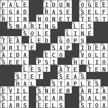 ACROSS 1. Diluted with white 5. Goddess of spring and wife of Bragi 9. Double curve, resembling the letter S 13. Mild oath 14. Raze (variant) 15. Oneself 16. It's straight from the horse's mouth 17. Music written for nine 18. Trial 19. Catching in a trap 21. French article 22. Flatfish 23. Actor's bit 24. Afternoon social gathering 27. Directed 28. Republicans 29. Compose 31. Plant excrement 32. It may be bright or harebrained 36. Opera by Verdi 37. Environmental prefix 38. Grand slam 39. Sew up the eyelids of hawks and falcons 40. Air pressure measure (abbr.) 41. Sun: prefix 42. For fear that 44. Had dinner 46. "___ Little Indians" 47. Proofreading order 48. Oceans 50. Actor Linden 51. Paper fasteners 54. Morally bad or wrong 56. Contemptuous expression 58. Operatic vocal solo 60. Beget 61. Wither 62. Lip ointment 63. Hearing organs 64. Snakelike fish 65. Portico DOWN 1. For each 2. Grows older 3. (Had) reclined 4. Ferber et al. 5. Pressed 6. Mild oath, euphamism for damn 7. Purpose 8. Fish or hair follower 9. Clearly or manifestly demonstrative 10. Honkers 11. Raised railways 12. Lizard (obsolete) 17. Mediterranean tributary 20. Hero or heavy, e.g. 21. Mouth edge 23. Trim (branches) 24. It was, poetically 25. One of the Great Lakes 26. Helper 28. E Mali city 30. Baron Munchausen's specialties 31. _-fi 33. Dunce 34. Writer Wiesel 35. A really long time 37. Eastern Standard Time (abbr.) 40. Pacific Standard Time (abbr.) 41. Pile 43. Snakelike fish 44. Michaelmas daisies 45. Separate forcefully 47. Bake eggs in their shells 49. Thick slices 51. Lick closed 52. Part of Q.E.F. 53. Grain storage tower 54. Compass dir. 55. By way of 56. Compass dir. 57. Born 59. Wet nurse (var.)