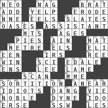 ACROSS 1. Modern: prefix 4. Tired old horse 7. Naughty child 11. Increase 12. Sharp bark 13. Eat (away) 14. Compass dir. 15. Snakelike fish 16. Chalkboards 17. Fertile tracts in a desert 19. Helper 21. Mountains (abbr.) 23. Grows older 24. Sliced desserts 25. The 18th letter of the Arabic alphabet 26. Floor protector 29. Distance measurement (Brit.) 30. Raised railways 31. Biblical high priest 32. Car or cant ending 33. Big collection agency 34. To separate or throw off 35. Acquire through effort 36. _-fi 37. Peak District village in England 40. Followers of ems 41. Area sheltered from the wind 42. Unable to walk 43. Examine minutely or intensely 45. Madame (abbr.) 46. Conclusion 51. Approach 55. Foolish or stupid persons 56. Mild oath, euphamism for damn 58. Compete 59. Impressive in appearance 60. Centimeter-gram-second unit of force 61. Wedding promise 62. Celtic language 63. Compass dir. 64. French article DOWN 1. Billionth: prefix 2. Pulitzer Prize-winning author Ferber 3. Lyric poems 4. Born 5. Silent film actress Nazimova 6. Global Positioning Systems (abbr.) 7. Naughty children 8. Round or rotation of duties 9. An important port of Yemen 10. Trial 12. Last 13. Otherwise 16. Public displays of written messages 18. Give off 20. Moves on water 22. Compass dir. 24. Actor Sean's family 25. Nest on high 26. Haggard of country music 27. Toward shelter 28. Make a knot 29. Count _ (2 wds.) 32. She-sheep 33. Ancient Celtic tribe of eastern Britain 36. Narrow boards 37. Shade tree 38. Break 39. So be it 43. Took without asking 44. Quote 46. Trig term 47. Aroma 48. Teases 49. Likelihood 50. Negative votes 52. Morally bad or wrong 53. Helper 54. Vintage cars 57. Compass dir.