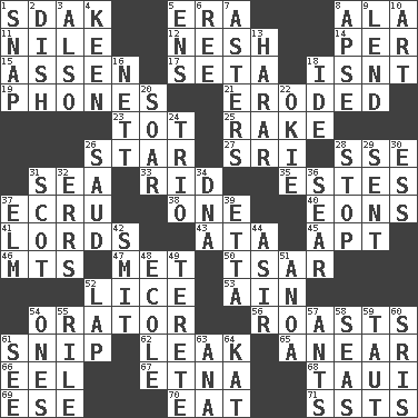 ACROSS 1. Neighbor of Neb. 5. Period 8. According to 11. "Death on the ____" 12. Soft 14. For each 15. NE Netherlands city 17. Bristle 18. Is not 19. Gives a jingle 21. Worn away 23. Small child 25. Immoral or dissolute person 26. Play the lead 27. Indian title of respect (Mr.) 28. Compass dir. 31. Ocean 33. To free from 35. _____ Park, CO 37. Shade of tan 38. Single 40. Immeasurably long periods of time 41. Titled peers of a realm 43. _ moment's notice (2 wds.) 45. Fitting 46. Mountains (abbr.) 47. Was introduced to 50. Russian ruler of old 52. Louse (plural) 53. The 18th letter of the Arabic alphabet 54. Speaker 56. Exposes to great heat 61. Sever or remove by pinching or nipping 62. Path through which fluid escapes 65. Approach 66. Snakelike fish 67. Inactive volcano in Sicily 68. "Change" in Tahitian 69. Compass dir. 70. Ingest 71. Fast planes DOWN 1. Fastener 2. Food container 3. In addition 4. Peachy ____! 5. Followers of ems 6. To sift 7. Michaelmas daisies 8. Domed church section 9. Grant temporary use of 10. Tate display 13. Ethiopian city, capital of Harari 16. Remaining after all deductions 18. Binary compound 20. Fly high 22. Migrant worker of the '30s 24. Musical group of three 26. Saudi Arabian king (1953-1964) 28. Close up, plug up 29. Emitted 30. Curvy letter 31. Native of Scotland 32. Blunders 34. Heredity factor (abbr.) 36. Shrivel 37. Shade tree 39. Singer James 42. Stricken, poetically 44. SW Saudi Arabia district 48. Learning spot: Fr. 49. Cylindrical with tapered ends 51. Small Philippine buffalo 52. Pet locale 54. Washington bills 55. Cause heat under the collar 57. Pismires 58. Oceans 59. Strained 60. Indian titles of respect 61. Perceive with the eye 63. Santa ___, CA 64. Krazy ___ of comics