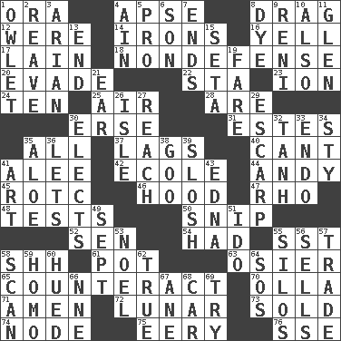 ACROSS 1. Mouth or opening 4. Domed church section 8. To draw with force 12. We are 14. Metal shackles 16. Shout 17. (Had) reclined 18. Unrelated to defense, as in spending 20. Dodge 22. R.R. building 23. Electrically charged atom 24. "___ Little Indians" 25. Wind 28. "We ___ not amused" (Victoria) 30. Celtic language 31. _____ Park, CO 35. Everything 37. Fails to keep up a pace 40. Patter 41. Toward shelter 42. Learning spot: Fr. 44. Actor Griffith 45. College mil. group 46. Parka part 47. 17th letter of the Greek alphabet 48. Trials 50. Sever or remove by pinching or nipping 52. Elected rep. 54. Possessed 55. Fast jet (abbr.) 58. Quiet! 61. Cooking vessel 63. Flexible twig of a willow tree 65. Frustrate 70. Rounded earthenware pot or jar 71. So be it 72. Type of eclipse 73. Disposed of to a purchaser 74. Thickened enlargement 75. Suggestive of the supernatural 76. Compass dir. DOWN 1. A small or young owl 2. Break or tear apart 3. Believer in; advocate of (suffix) 4. The 18th letter of the Arabic alphabet 5. Adept person 6. Male child 7. Conclusions 8. Color 9. Painter Guido (1575-1642) 10. In addition 11. Small, secluded valley 13. Conclude 15. Bristle 19. Conductor's collection 21. Ewer handle 26. Capri or Wight 27. Arrive at 29. Fortification 30. Opts 32. Hyperbolic tangent 33. Inside; within (prefix) 34. Filthy place 35. _ vera 36. Allows 38. Thick or sticky substance 39. Make a splashing sound 41. Nonscientific branch of learning 43. Pulitzer Prize-winning author Ferber 49. Back-to-school mo. 51. Wedding promise 53. Christmas carol 55. Grain storage towers 56. Exchanges for money 57. Buy and sell 58. Examine minutely or intensely 59. Like (prefix) 60. Took on color 62. Loyal 64. Distress signal 66. Compass dir. 67. A saturated hydrocarbon 68. Auto 69. Attempt to accomplish something