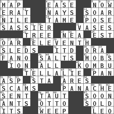 ACROSS 1. Atlas unit 4. Comfort 8. Immediately 11. Part of Q.E.F. 13. Negative votes 14. Fly high 15. "Death on the ____" 16. Docile 17. Airs 18. More disrespectful 21. Flower holders 22. Relationship diagram 23. Teachers' org. 25. Eastern Standard Time (abbr.) 26. Rowing implement 29. Veterans Day date 32. Bobsleighs 34. It would 35. Mouth or opening 38. Papal veil 39. Table seasonings 41. Crowds into 43. Electrically charged atom 44. 100% 45. Dried seaweed eaten as food 46. Copy Pinocchio 50. Baking dish 51. Cleo's killer 54. R.R. building 55. Ancient Greek god of war 57. Fraudulent business schemes 59. Flamboyance 63. Posted 64. Drawn tight 67. Within a short period 68. Pismires 69. Von Bismarck 70. Disposed of to a purchaser 71. It is 72. Shed a tear 73. Lion DOWN 1. Not women's 2. Operatic vocal solo 3. Friends 4. Main course 5. American Automobile Association (abbr.) 6. Symbol (abbr.) 7. Compass dir. 8. Trap for birds or small mammals 9. Fertile tracts in a desert 10. Obtain by seizing forcibly or violently 12. Trial 14. Health resort 19. Angers 20. Snakelike fish 21. Large container 23. Remaining after all deductions 24. Extremities 26. Order of Saint Francis (abbr.) 27. Mountain range southwest of Kyrgyzstan 28. Former U.S. Attorney General Janet 30. Country estate 31. Like (prefix) 33. Do not 36. Frolic 37. Swedish rock group 39. Table seasoning 40. Silent film actress Nazimova 42. Player for Phoenix 45. Peachy ____! 47. Double-curved letter 48. Portable computer 49. Lyricist Gershwin 51. Slender Brazilian palm 52. Odor 53. Leg coverings 56. Backtalk 58. Mountains (abbr.) 60. Calm and collected 61. Opening into or through something 62. Inside; within (prefix) 64. Pull behind 65. Had dinner 66. Shoshoni