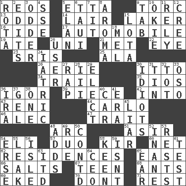 ACROSS 1. Vintage cars 5. Singer James 9. Torque (variant) 13. Probability 14. Den 15. Member of a famous L.A. basketball team 16. Periodic rise and fall of the sea level 17. Form of transportation 19. Had dinner 20. Corn or form start 21. Was introduced to 22. Sight organ 23. Indian titles of respect 25. Chicken ___ king 26. Nest on high 30. "Tell ____ the Marines!" 34. Lag or linger behind 35. "Vaya con ____" 36. Russian composer Stravinsky 39. Part 42. To the inside or interior of 43. Painter Guido (1575-1642) 44. Monte _, Las Vegas Hotel/Casino 46. Actor Baldwin 47. Distinguishing feature 48. Curve 51. SW Saudi Arabia district 54. Biblical high priest 57. Superhero pair 58. Apertif with cassis 60. Fish or hair follower 62. Homes 65. Comfort 66. Table seasonings 67. Adolescent 68. Pismires 69. Made supply last 70. Do not 71. Respite DOWN 1. Roll call or roster of names 2. Proofreads 3. More peculiar 4. Compass dir. 5. Liveliness 6. "Change" in Tahitian 7. Teat (slang) 8. Odor 9. Keyboard key 10. Migrant worker of the '30s 11. Trust 12. Algonquian 15. Globular water bottle used in Asia 18. Cartoonist voice _ Blanc 20. One who makes use of a thing 24. Of or pertaining to medicine 27. Reproach for some lapse or misdeed 28. One more than two 29. Opt 30. Foolish or stupid persons 31. Shallow baking pan 32. Small child 33. Bear (Spanish) 36. Lyricist Gershwin 37. Set 38. Single 40. Auto 41. Epoch 45. One who doesn't tell the truth 48. Does sums 49. Regret 50. Continued (abbr.) 52. Silly 53. Musical pauses 54. Celtic language 55. Path through which fluid escapes 56. Small island 58. Peachy ____! 59. Is not 61. Trial 63. It would 64. Corporate head (abbr.) 65. Ewer handle